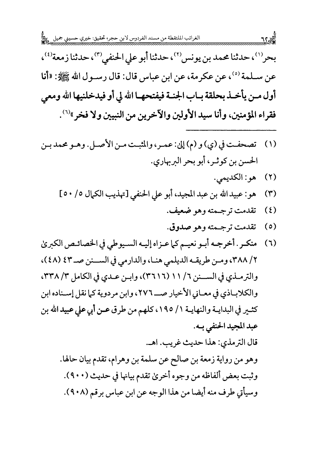 بحر (¬١)، حدثنا محمد بن يونس (¬٢)، حدثنا أبو علي الحنفي (¬٣)، حدثنا زمعة (¬٤)، عن سلمة (¬٥)، عن عكرمة، عن ابن عباس قال: قال رسول الله - صَلَّى اللهُ عَلَيْهِ وَسَلَّمَ -: "أنا أول من يأخذ بحلقة باب الجنة فيفتحها الله لي أو فيدخلنيها الله ومعي فقراء المؤمنين، وأنا سيد الأولين والآخرين من النبيين ولا فخر" (¬٦).