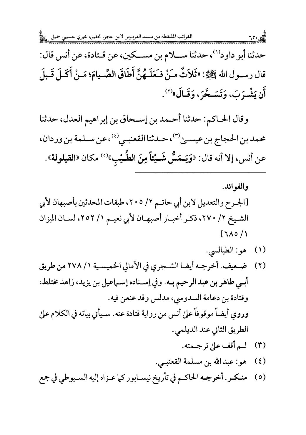 وقال الحاكم: حدثنا أحمد بن إسحاق بن إبراهيم العدل، حدثنا محمد بن الحجاج بن عيسى (¬٣)، حدثنا القعنبي (¬٤)، عن سلمة بن وردان، عن أنس، إلا أنه قال: "وَيَمَسُّ شَيْئًا مِنَ الطِّيْبِ" (¬٥) مكان "القيلولة".