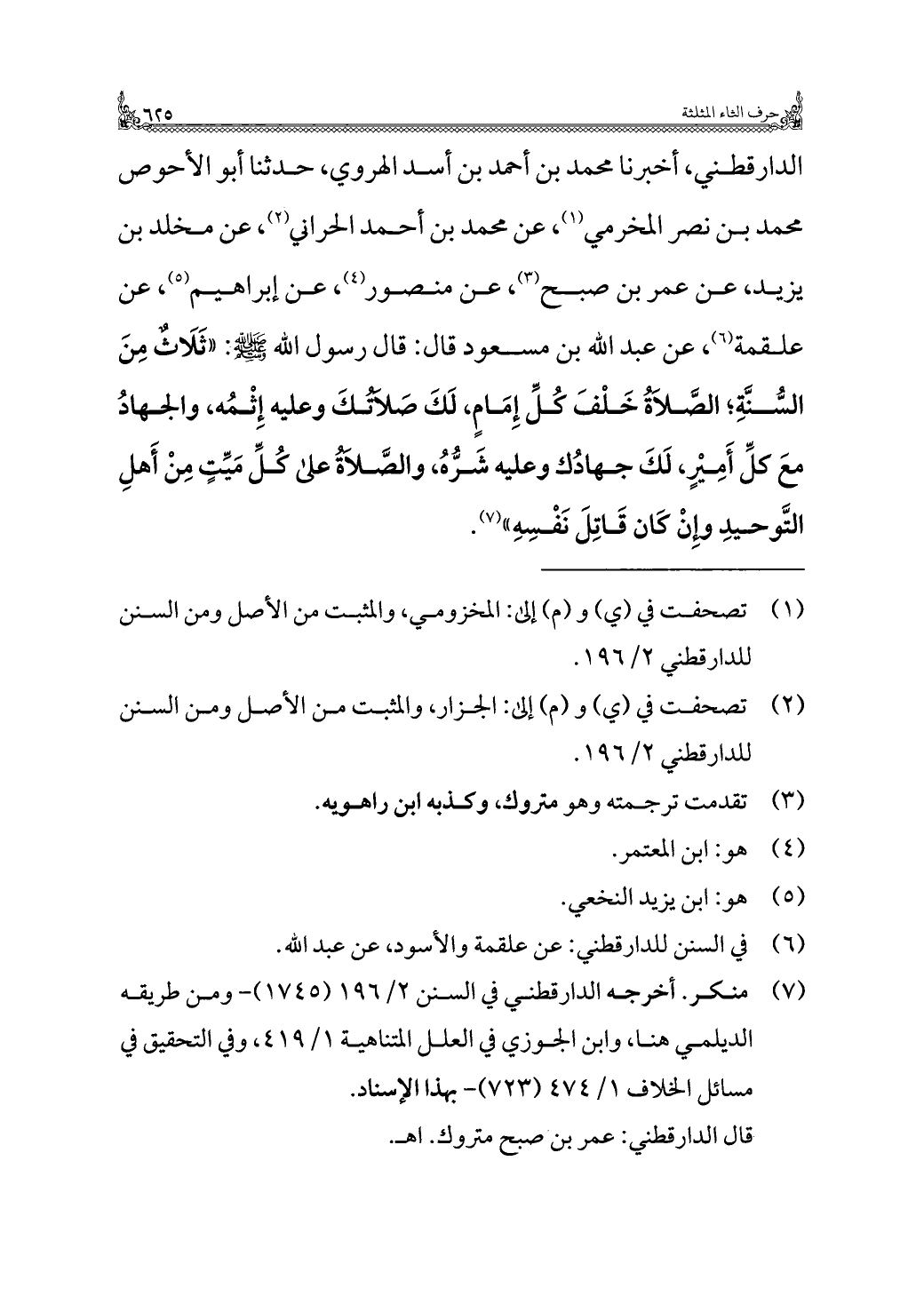 الدارقطني، أخبرنا محمد بن أحمد بن أسد الهروي، حدثنا أبو الأحوص محمد بن نصر المخرمي (¬١)، عن محمد بن أحمد الحراني (¬٢)، عن مخلد بن يزيد، عن عمر بن صبح (¬٣)، عن منصور (¬٤)، عن إبراهيم (¬٥)، عن علقمة (¬٦)، عن عبد الله بن مسعود قال: قال رسول الله - صلى الله عليه وسلم -: "ثَلَاثٌ مِنَ السُّنَّةِ؛ الصَّلاةُ خلْفَ كُلِّ إِمَامٍ، لَكَ صَلَاتُكَ وعليه إِثْمُه، والجهادُ معَ كلِّ أَمِيْرٍ، لَكَ جهادُك وعليه شَرُّهُ، والصَّلَاةُ على كُلِّ مَيِّتٍ مِنْ أَهلِ التَّوحيدِ وإِنْ كَان قَاتِلَ نَفْسِهِ" (¬٧).