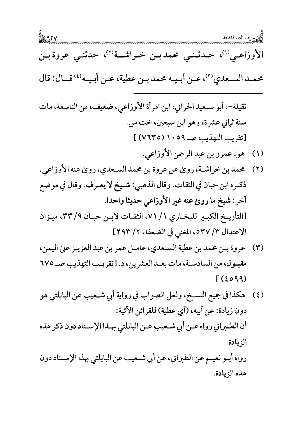 (¬٢) محمد بن خراشة، روى عن عروة بن محمد السعدي، روى عنه الأوزاعي. ذكره ابن حبان في الثقات. وقال الذهبي: شيخ لا يعرف. وقال في موضع آخر: شيخ ما روى عنه غير الأوزاعي حديثا واحدا.