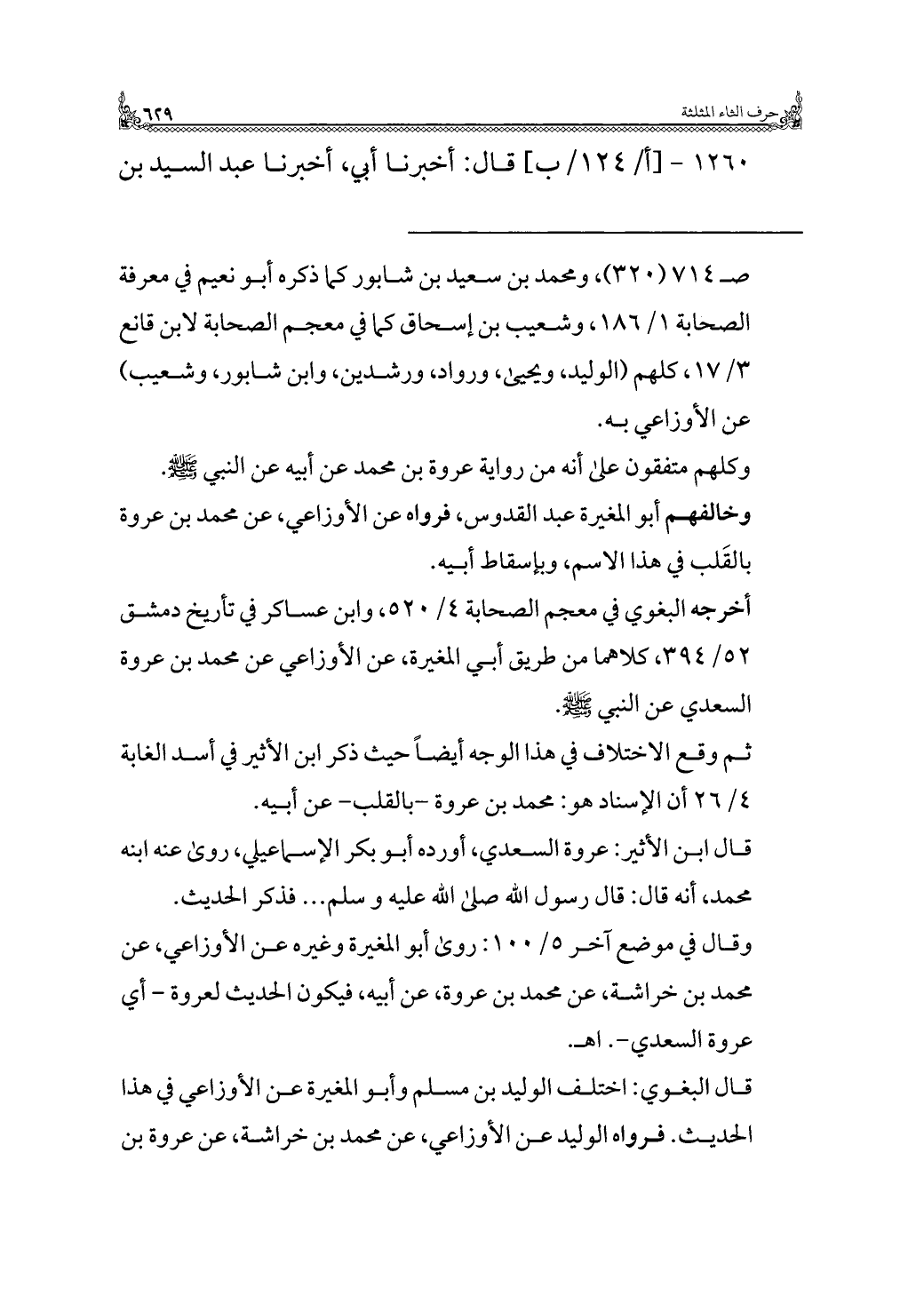 ثم وقع الاختلاف في هذا الوجه أيضًا حيث ذكر ابن الأثير في أسد الغابة ٤/ ٢٦ أن الإسناد هو: محمد بن عروة - بالقلب - عن أبيه.