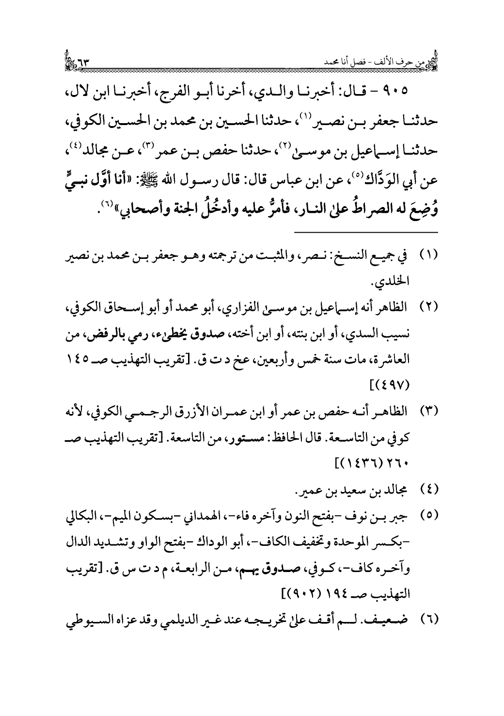 ٩٠٥ - قال: أخبرنا والدي، أخبرنا أبو الفرج، أخبرنا ابن لال، حدثنا جعفر بن نصير (¬١)، حدثنا الحسين بن محمد بن الحسين الكوفي، حدثنا إسماعيل بن موسى (¬٢)، حدثنا حفص بن عمر (¬٣)، عن مجالد (¬٤)، عن أبي الوَدَّاك (¬٥)، عن ابن عباس قال: قال رسول الله - صَلَّى اللهُ عَلَيْهِ وَسَلَّمَ -: "أنا أوَّل نبيٍّ وُضِعَ له الصراطُ على النار، فأمرُّ عليه وأدخُلُ الجنة وأصحابي" (¬٦).