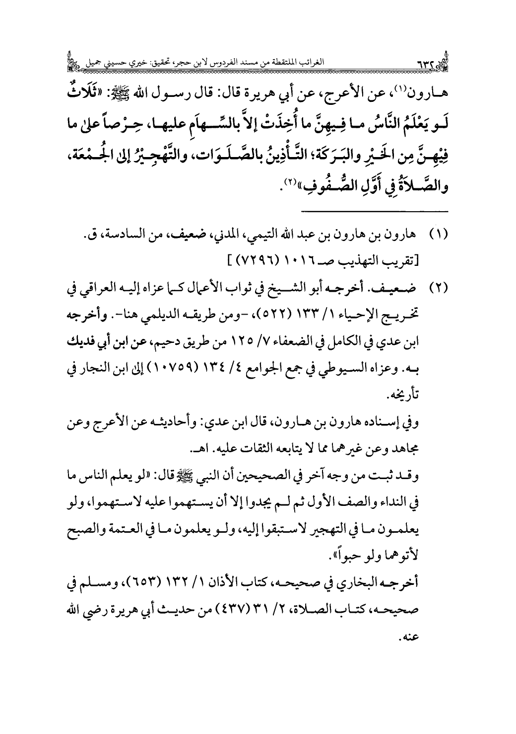 هارون (¬١)، عن الأعرج، عن أبي هريرة قال: قال رسول الله - صلى الله عليه وسلم -: "ثَلَاثٌ لَو يَعْلَمُ النَّاسُ ما فِيهِنَّ ما أُخِذَتْ إلَّا بالسِّهَامِ عليها، حِرْصًا على ما فِيْهِنَّ مِن الخَيْرِ والبَرَكَة؛ التَّأْذِينُ بالصَّلَوَات، والتَّهْجِيْرُ إلى الجُمْعَة، والصَّلَاةُ فِي أَوَّلِ الصُّفُوفِ" (¬٢).