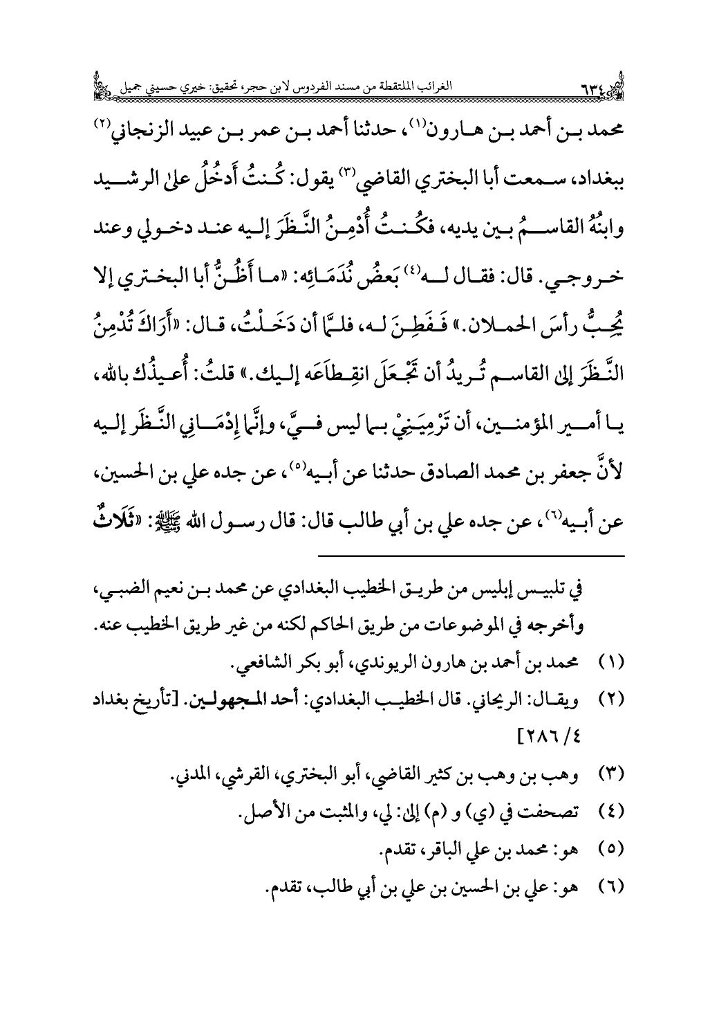 محمد بن أحمد بن هارون (¬١)، حدثنا أحمد بن عمر بن عبيد الزنجاني (¬٢) ببغداد، سمعت أبا البختري القاضي (¬٣) يقول: كُنتُ أَدخُلُ على الرشيد وابنُهُ القاسمُ بين يديه، فكُنتُ أُدْمِنُ النَّظَرَ إليه عند دخولي وعند خروجي. قال: فقال له (¬٤) بَعضُ نُدَمَائِه: "ما أَظُنُّ أبا البختري إلا يُحِبُّ رأسَ الحملان". فَفَطِنَ له، فلمَّا أن دَخَلْتُ، قال: "أَرَاكَ تُدْمِنُ النَّظَرَ إلى القاسم تُريدُ أن تَجْعَلَ انقِطَاعَه إليك". قلتُ: أُعيذُك بالله، يا أمير المؤمنين، أن تَرْمِيَنِيْ بما ليس فيَّ، وإنَّما إِدْمَانِي النَّظَر إليه لأنَّ جعفر بن محمد الصادق حدثنا عن أبيه (¬٥)، عن جده علي بن الحسين، عن أبيه (¬٦)، عن جده علي بن أبي طالب قال: قال رسول الله - صلى الله عليه وسلم -: "ثَلَاثٌ