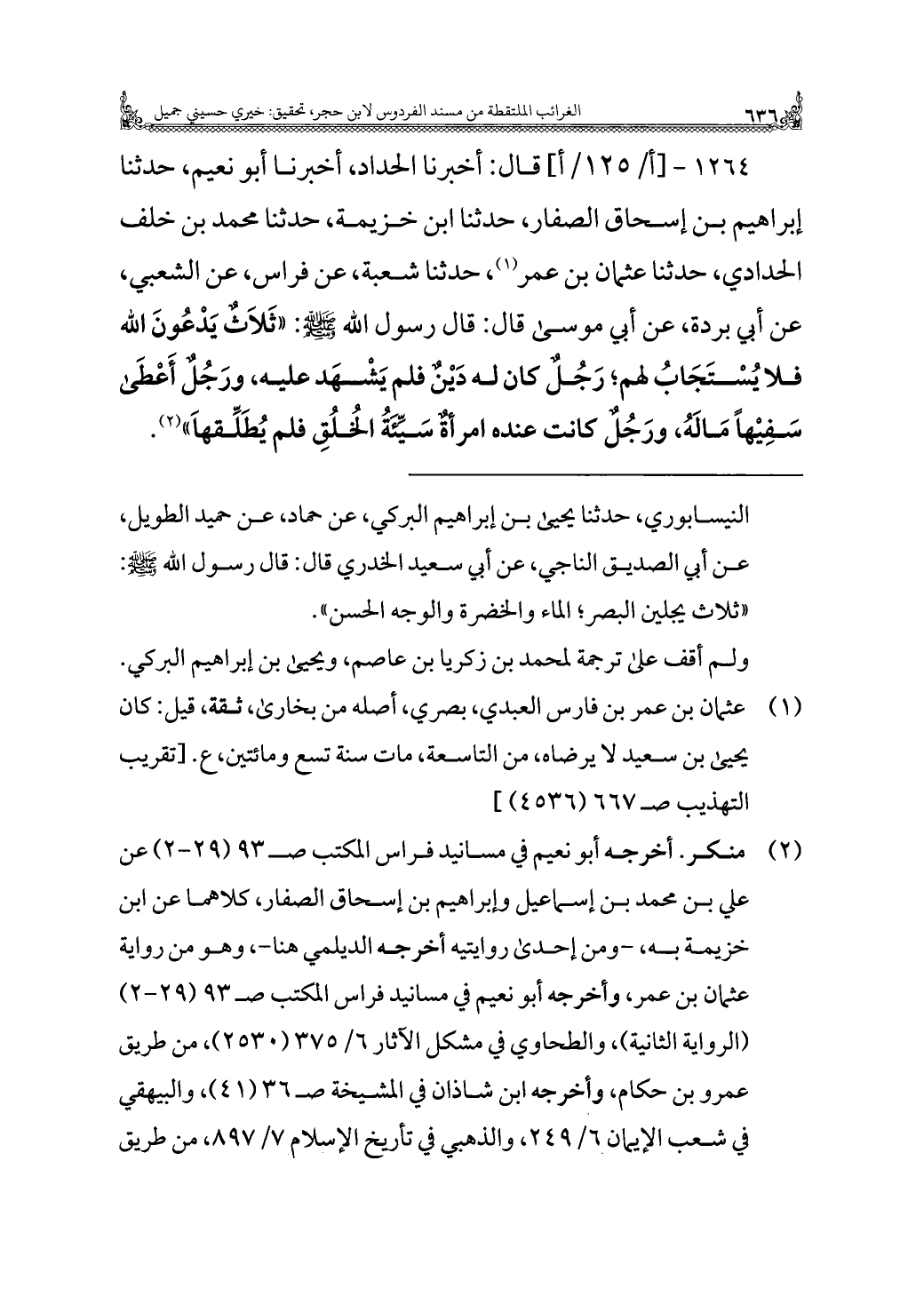 ١٢٦٤ - قال: أخبرنا الحداد، أخبرنا أبو نعيم، حدثنا إبراهيم بن إسحاق الصفار، حدثنا ابن خزيمة، حدثنا محمد بن خلف الحدادي، حدثنا عثمان بن عمر (¬١)، حدثنا شعبة، عن فراس، عن الشعبي، عن أبي بردة، عن أبي موسى قال: قال رسول الله - صلى الله عليه وسلم -: "ثَلَاثٌ يَدْعُونَ الله فلا يُسْتَجَابُ لهم؛ رَجُلٌّ كان له دَيْنٌ فلم يَشْهَد عليه، ورَجُلٌّ أَعْطَى سَفِيْهًا مَالَهُ ورَجُلٌ كانت عنده امرأةٌ سَيِّئَةُ الخُلُقِ فلم يُطَلِّقهَا" (¬٢).