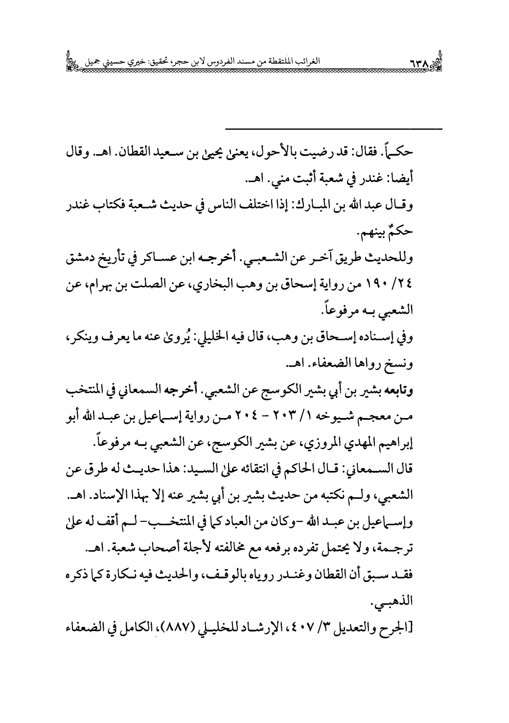 قال السمعاني: قال الحاكم في انتقائه على السيد: هذا حديث له طرق عن الشعبي، ولم نكتبه من حديث بشير بن أبي بشير عنه إلا بهذا الإسناد. اهـ. وإسماعيل بن عبد الله - وكان من العباد كما في المنتخب - لم أقف له على ترجمة، ولا يحتمل تفرده برفعه مع مخالفته لأجلة أصحاب شعبة. اهـ.