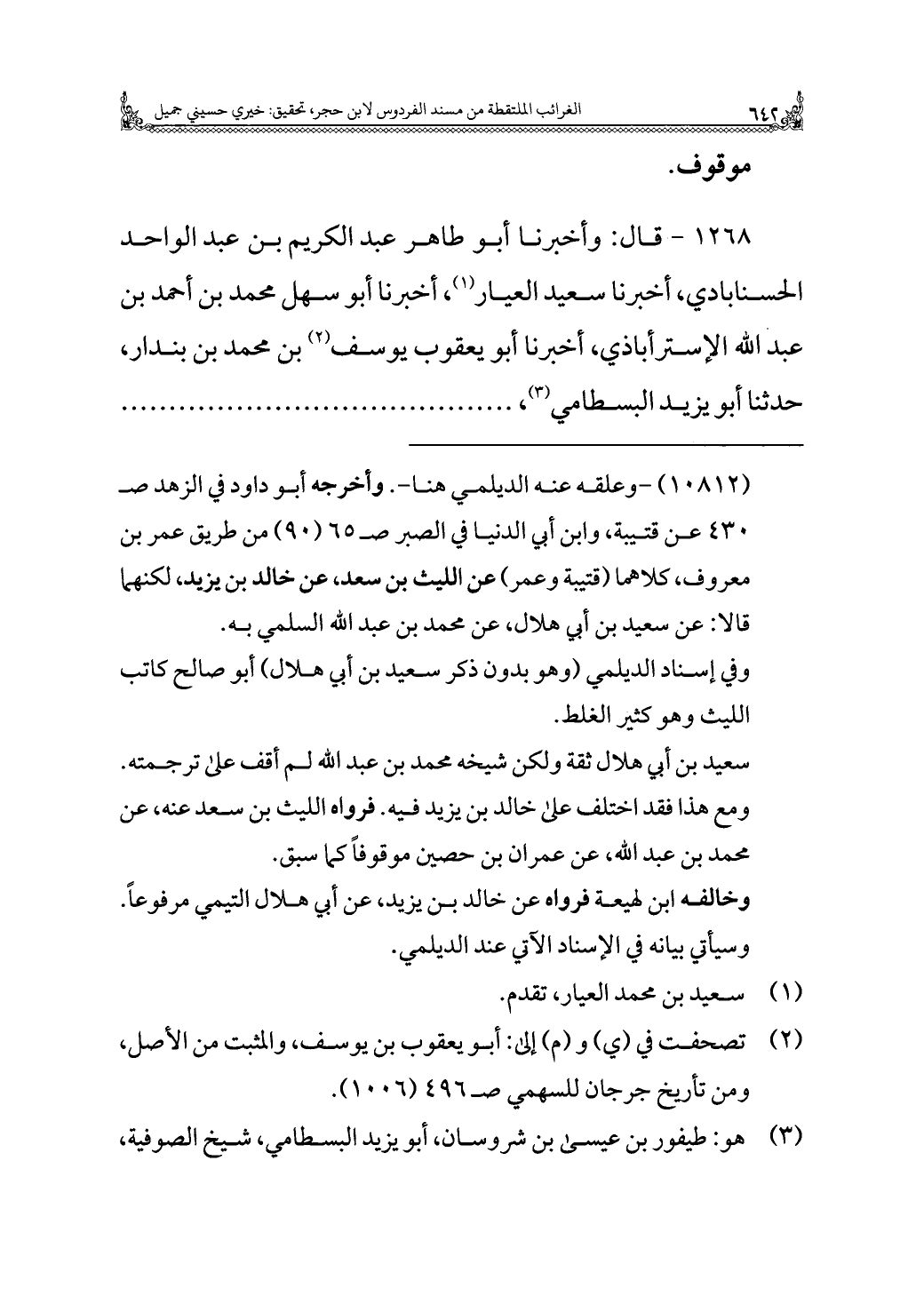 ١٢٦٨ - قال: وأخبرنا أبو طاهر عبد الكريم بن عبد الواحد الحسنابادي، أخبرنا سعيد العيار (¬١)، أخبرنا أبو سهل محمد بن أحمد بن عبد الله الإسترأباذي، أخبرنا أبو يعقوب يوسف (¬٢) بن محمد بن بندار، حدثنا أبو يزيد البسطامي (¬٣)، . . . . . . . . . . . . . . . . . .