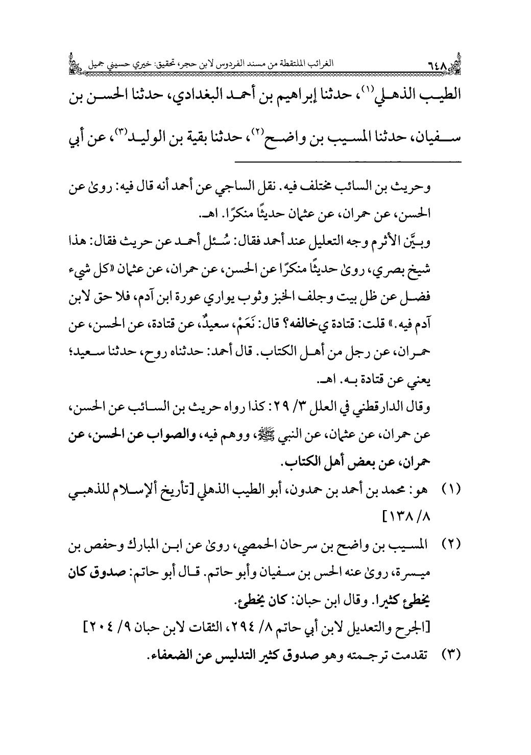 وبيَّن الأثرم وجه التعليل عند أحمد فقال: سُئل أحمد عن حريث فقال: هذا شيخ بصري، روى حديثًا منكرًا عن الحسن، عن حمران، عن عثمان "كل شيء فضل عن ظل بيت وجلف الخبز وثوب يواري عورة ابن آدم، فلا حق لابن آدم فيه". قلت: قتادة ي خالفه؟ قال: نَعَمْ، سعيدٌ، عن قتادة، عن الحسن، عن حمران، عن رجل من أهل الكتاب. قال أحمد: حدثناه روح، حدثنا سعيد؛ يعني عن قتادة به. اهـ.