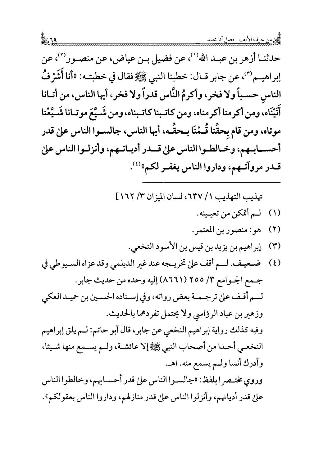 حدثنا أزهر بن عبد الله (¬١)، عن فضيل بن عياض، عن منصور (¬٢)، عن إبراهيم (¬٣)، عن جابر قال: خطبنا النبي - صَلَّى اللهُ عَلَيْهِ وَسَلَّمَ - فقال في خطبته: "أنا أَشَرْفُ الناسِ حسبًا ولا فخر، وأكرمُ النَّاس قدرًا ولا فخر، أيها الناس، من أتانا أَتَيْنَاه، ومن أكرمنا أكرمناه، ومن كاتبنا كاتبناه، ومن شَيَّعَ موتانا شَيَّعْنا موتاه، ومن قام بِحقِّنا قُمْنَا بحقِّه، أيها الناس، جالسوا الناس على قدر أحسابهم، وخالطوا الناس على قدر أديانهم، وأنزلوا الناس على قدر مروآتهم، وداروا الناس يغفر لكم" (¬٤).