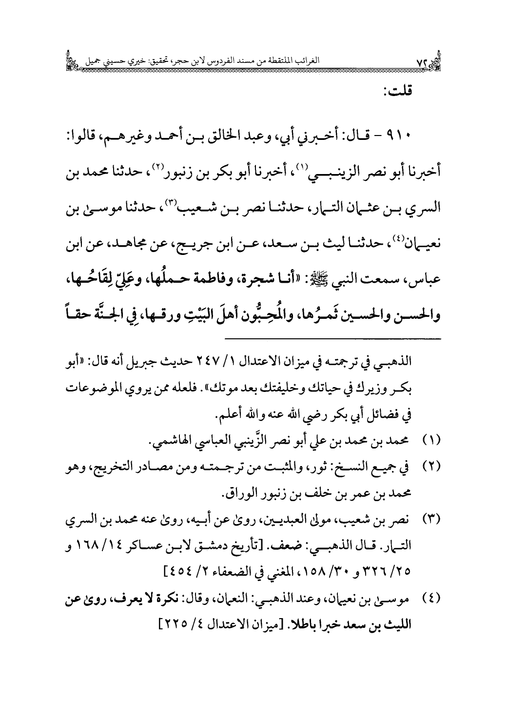٩١٠ - قال: أخبرني أبي، وعبد الخالق بن أحمد وغيرهم، قالوا: أخبرنا أبو نصر الزينبي (¬١)، أخبرنا أبو بكر بن زنبور (¬٢)، حدثنا محمد بن السري بن عثمان التمار، حدثنا نصر بن شعيب (¬٣)، حدثنا موسى بن نعيمان (¬٤)، حدثنا ليث بن سعد، عن ابن جريج، عن مجاهد، عن ابن عباس، سمعت النبي - صَلَّى اللهُ عَلَيْهِ وَسَلَّمَ -: "أنا شجرة، وفاطمة حملُها، وعَلِيّ لِقَاحُها، والحسن والحسين ثَمرُها، والمُحِبُّون أهلَ البَيْتِ ورقها، فِي الجنَّة حقًّا