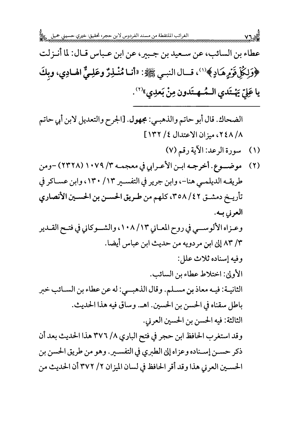 عطاء بن السائب، عن سعيد بن جبير، عن ابن عباس قال: لما أنزلت {وَلِكُلِّ قَوْمٍ هَادٍ} (¬١)، قال النبي - صَلَّى اللهُ عَلَيْهِ وَسَلَّمَ -: "أنا مُنْذِرٌ وعَلِيٌّ الهادِي، وبِكَ يا عَلِيّ يَهْتَدي المُهتَدون مِنْ بَعدِي" (¬٢).
