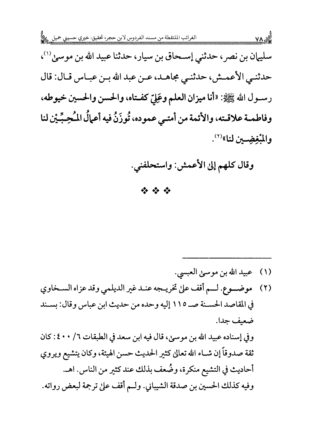 سليمان بن نصر، حدثني إسحاق بن سيار، حدثنا عبيد الله بن موسى (¬١)، حدثني الأعمش، حدثني مجاهد، عن عبد الله بن عباس قال: قال رسول الله - صَلَّى اللهُ عَلَيْهِ وَسَلَّمَ -: "أنا ميزان العلم وعَلِيّ كفتاه، والحسن والحسين خيوطه، وفاطمة علاقته، والأئمة من أمتي عموده، تُوزَنُ فيه أعمالُ المُحِبِّيْن لنا والمبْغِضِين لنا" (¬٢).