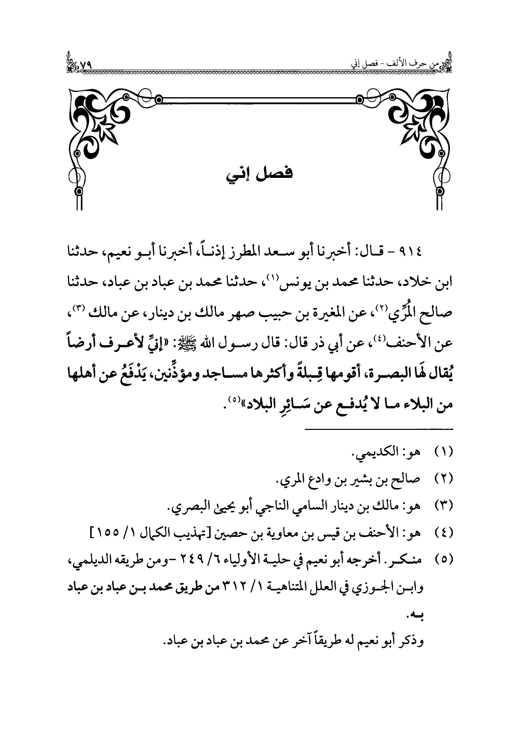 ٩١٤ - قال: أخبرنا أبو سعد المطرز إذنًا، أخبرنا أبو نعيم، حدثنا ابن خلاد، حدثنا محمد بن يونس (¬١)، حدثنا محمد بن عباد بن عباد، حدثنا صالح المُرِّي (¬٢)، عن المغيرة بن حبيب صهر مالك بن دينار، عن مالك (¬٣)، عن الأحنف (¬٤)، عن أبي ذر قال: قال رسول الله - صَلَّى اللهُ عَلَيْهِ وَسَلَّمَ -: "إنِّي لأعرف أرضًا يُقال لهَا البصرة، أقومها قِبلةً وأكثرها مساجد ومؤذّنين، يَدْفَعُ عن أهلها من البلاء ما لا يُدفع عن سَائِرِ البلاد" (¬٥).