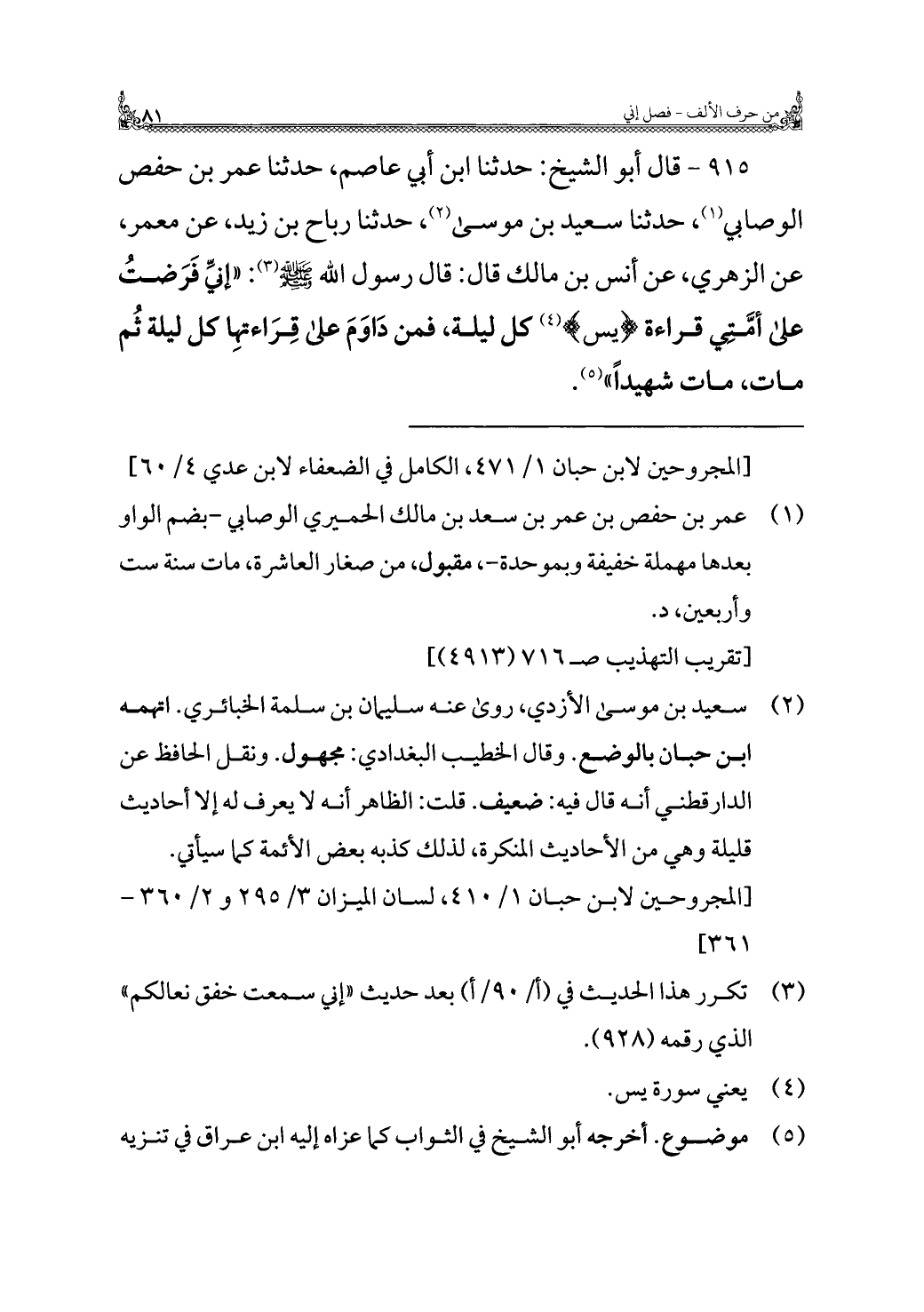 ٩١٥ - قال أبو الشيخ: حدثنا ابن أبي عاصم، حدثنا عمر بن حفص الوصابي (¬١)، حدثنا سعيد بن موسى (¬٢)، حدثنا رباح بن زيد، عن معمر، عن الزهري، عن أنس بن مالك قال: قال رسول الله - صَلَّى اللهُ عَلَيْهِ وَسَلَّمَ - (¬٣): "إنِّي فَرَضتُ على أمَّتي قراءة {يس} (¬٤) كل ليلة، فمن دَاوَمَ على قِرَاءتهِا كل ليلة ثُم مات، مات شهيدًا" (¬٥).