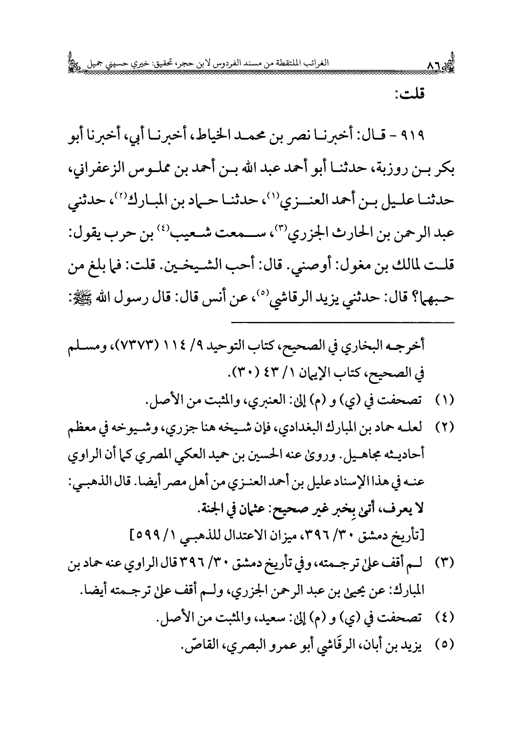 ٩١٩ - قال: أخبرنا نصر بن محمد الخياط، أخبرنا أبي، أخبرنا أبو بكر بن روزبة، حدثنا أبو أحمد عبد الله بن أحمد بن مملوس الزعفراني، حدثنا عليل بن أحمد العنزي (¬١)، حدثنا حماد بن المبارك (¬٢)، حدثني عبد الرحمن بن الحارث الجزري (¬٣)، سمعت شعيب (¬٤) بن حرب يقول: قلت لمالك بن مغول: أوصني. قال: أحب الشيخين. قلت: فما بلغ من حبهما؟ قال: حدثني يزيد الرقاشي (¬٥)، عن أنس قال: قال رسول الله - صَلَّى اللهُ عَلَيْهِ وَسَلَّمَ -: