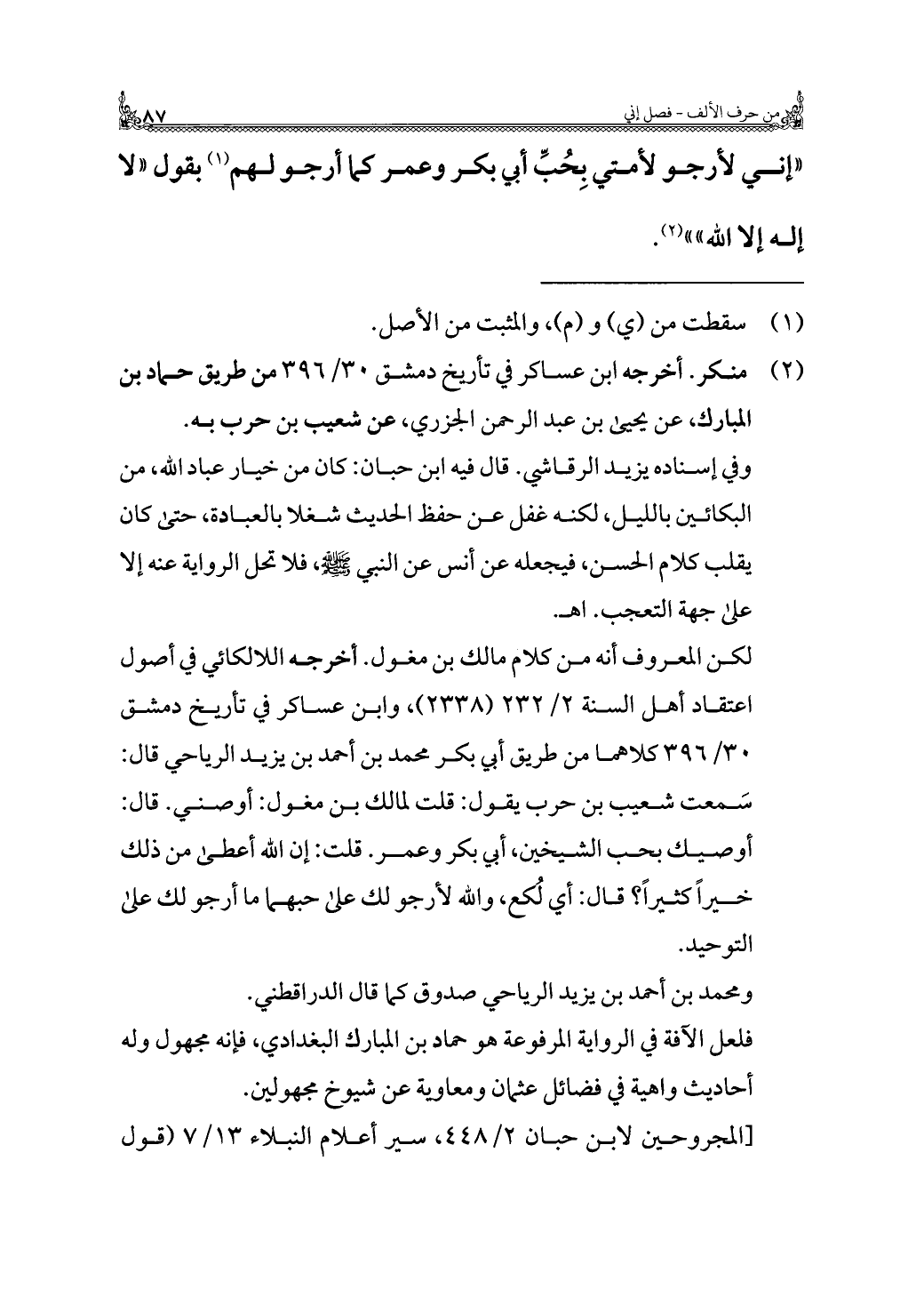 فلعل الآفة في الرواية المرفوعة هو حماد بن المبارك البغدادي، فإنه مجهول وله أحاديث واهية في فضائل عثمان ومعاوية عن شيوخ مجهولين.