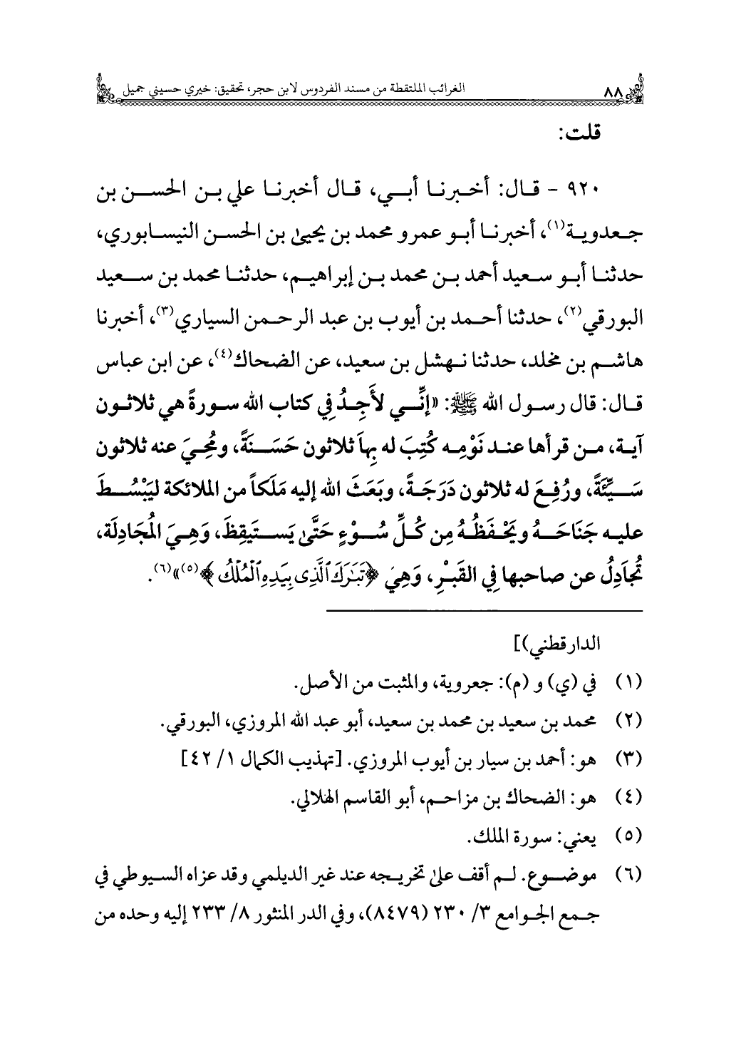٩٢٠ - قال: أخبرنا أبي، قال أخبرنا علي بن الحسن بن جعدوية (¬١)، أخبرنا أبو عمرو محمد بن يحيى بن الحسن النيسابوري، حدثنا أبو سعيد أحمد بن محمد بن إبراهيم، حدثنا محمد بن سعيد البورقي (¬٢)، حدثنا أحمد بن أيوب بن عبد الرحمن السياري (¬٣)، أخبرنا هاشم بن مخلد، حدثنا نهشل بن سعيد، عن الضحاك (¬٤)، عن ابن عباس قال: قال رسول الله - صَلَّى اللهُ عَلَيْهِ وَسَلَّمَ -: "إنِّي لأَجِدُ فِي كتاب الله سورةً هي ثلاثون آية، من قرأها عند نَوْمِه كُتِبَ له بِهاَ ثلاثون حَسَنهً، ومُحِيَ عنه ثلاثون سَيِّئَةً، ورُفِعَ له ثلاثون دَرَجَةً، وبَعَثَ الله إليه مَلكًا من الملائكة ليَبْسُطَ عليه جَنَاحَهُ ويَحْفَظُهُ مِن كُلِّ سُوْءٍ حَتَّى يَستَيقِظَ، وَهِيَ المُجَادِلَة، تُجاَدِلُ عن صاحبها فِي القَبْرِ، وَهِي {تَبَارَكَ الَّذِي بِيَدِهِ الْمُلْكُ} (¬٥) " (¬٦).