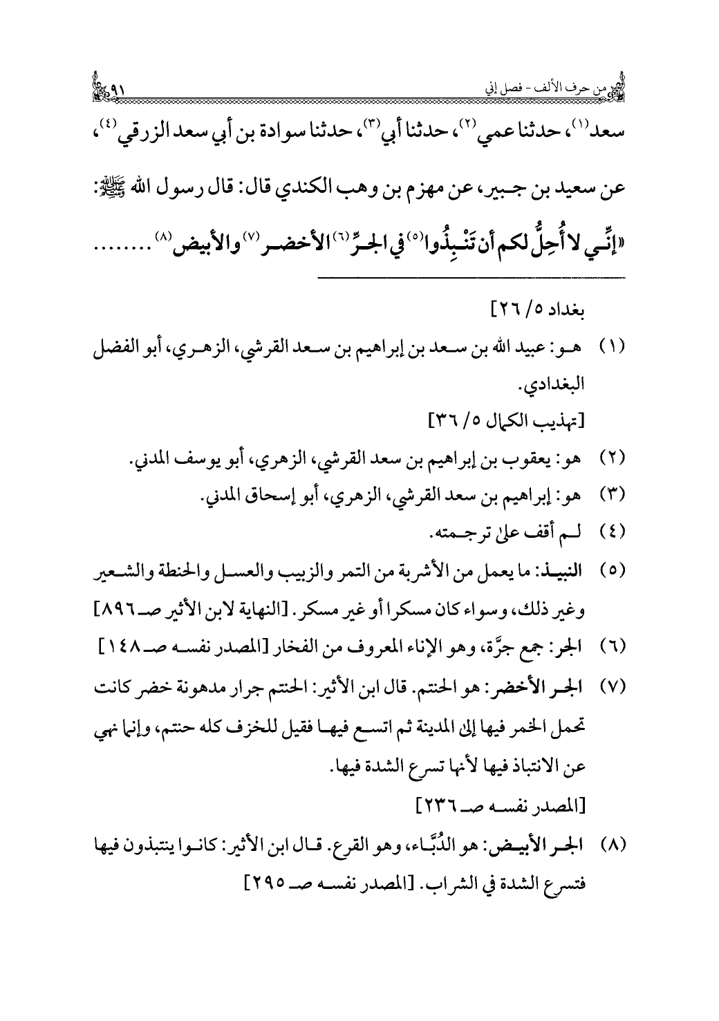 (¬٥) النبيذ: ما يعمل من الأشربة من التمر والزبيب والعسل والحنطة والشعير وغير ذلك، وسواء كان مسكرا أو غير مسكر. [النهاية لابن الأثير صـ ٨٩٦]