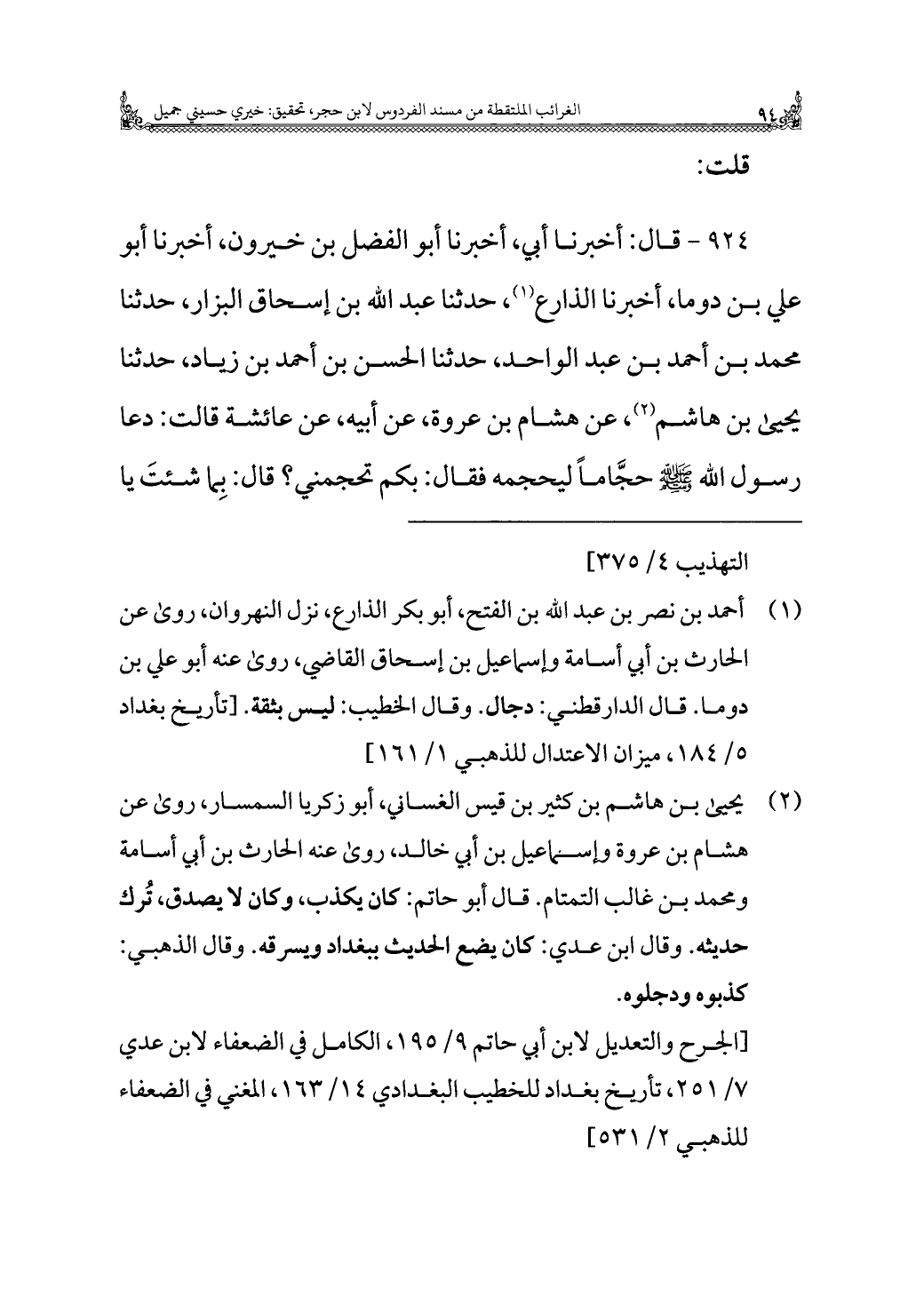 ٩٢٤ - قال: أخبرنا أبي، أخبرنا أبو الفضل بن خيرون، أخبرنا أبو علي بن دوما، أخبرنا الذارع (¬١)، حدثنا عبد الله بن إسحاق البزار، حدثنا محمد بن أحمد بن عبد الواحد، حدثنا الحسن بن أحمد بن زياد، حدثنا يحيى بن هاشم (¬٢)، عن هشام بن عروة، عن أبيه، عن عائشة قالت: دعا رسول الله - صَلَّى اللهُ عَلَيْهِ وَسَلَّمَ - حجَّامًا ليحجمه فقال: بكم تحجمني؟ قال: بِما شئتَ يا