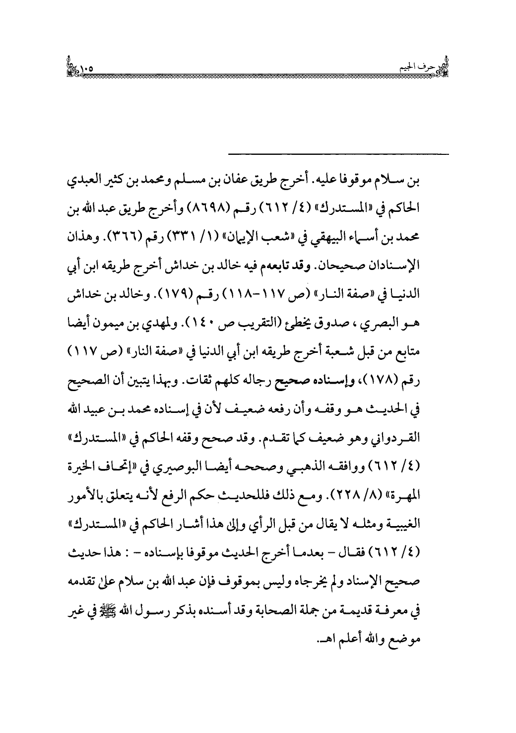 = بن سلام موقوفًا عليه. أخرج طريق عفان بن مسلم ومحمد بن كثير العبدي الحاكم في "المستدرك" (٤/ ٦١٢) رقم (٨٦٩٨) وأخرج طريق عبد الله بن محمد بن أسماء البيهقي في "شعب الإيمان" (١/ ٣٣١) رقم (٣٦٦). وهذان الإسنادان صحيحان. وقد تابعه م فيه خالد بن خداش أخرج طريقه ابن أبي الدنيا في "صفة النار" (ص ١١٧ - ١١٨) رقم (١٧٩). وخالد بن خداش هو البصري، صدوق يخطئ (التقريب ص ١٤٠). ولمهدي بن ميمون أيضًا متابع من قبل شعبة أخرج طريقه ابن أبي الدنيا في "صفة النار" (ص ١١٧) رقم (١٧٨)، وإسناده صحيح رجاله كلهم ثقات. وبهذا يتبين أن الصحيح في الحديث هو وقفه وأن رفعه ضعيف لأن في إسناده محمد بن عبيد الله القردواني وهو ضعيف كما تقدم. وقد صحح وقفه الحاكم في "المستدرك" (٤/ ٦١٢) ووافقه الذهبي وصححه أيضًا البوصيري في "إتحاف الخيرة المهرة" (٨/ ٢٢٨). ومع ذلك فللحديث حكم الرفع لأنه يتعلق بالأمور الغيبية ومثله لا يقال من قبل الرأي وإلى هذا أشار الحاكم في "المستدرك" (٤/ ٦١٢) فقال - بعدما أخرج الحديث موقوفًا بإسناده -: هذا حديث صحيح الإسناد ولم يخرجاه وليس بموقوف فإن عبد الله بن سلام على تقدمه في معرفة قديمة من جملة الصحابة وقد أسنده بذكر رسول الله - صلى الله عليه وسلم - في غير موضع والله أعلم اهـ.