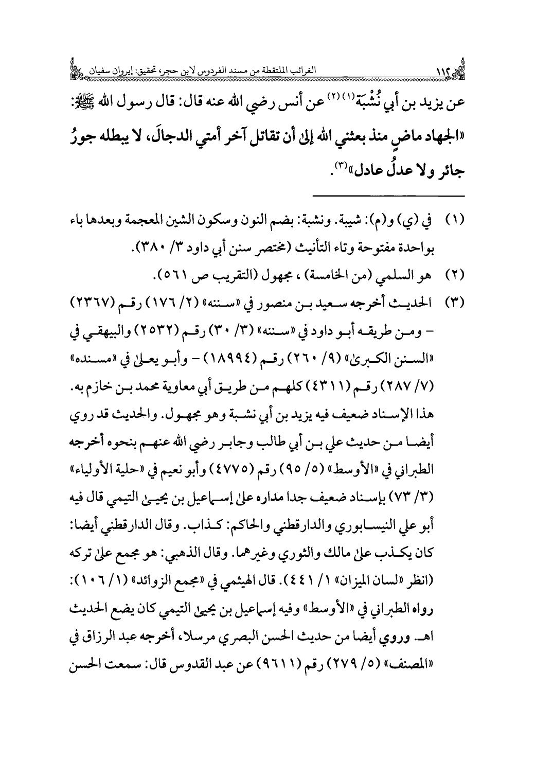 عن يزيد بن أبي نُشْبَة (¬١) (¬٢) عن أنس رضي الله عنه قال: قال رسول الله - صلى الله عليه وسلم -: "الجهاد ماضٍ منذ بعثني الله إلى أن تقاتل آخر أمتي الدجالَ، لا يبطله جورُ جائر ولا عدلُ عادل" (¬٣).