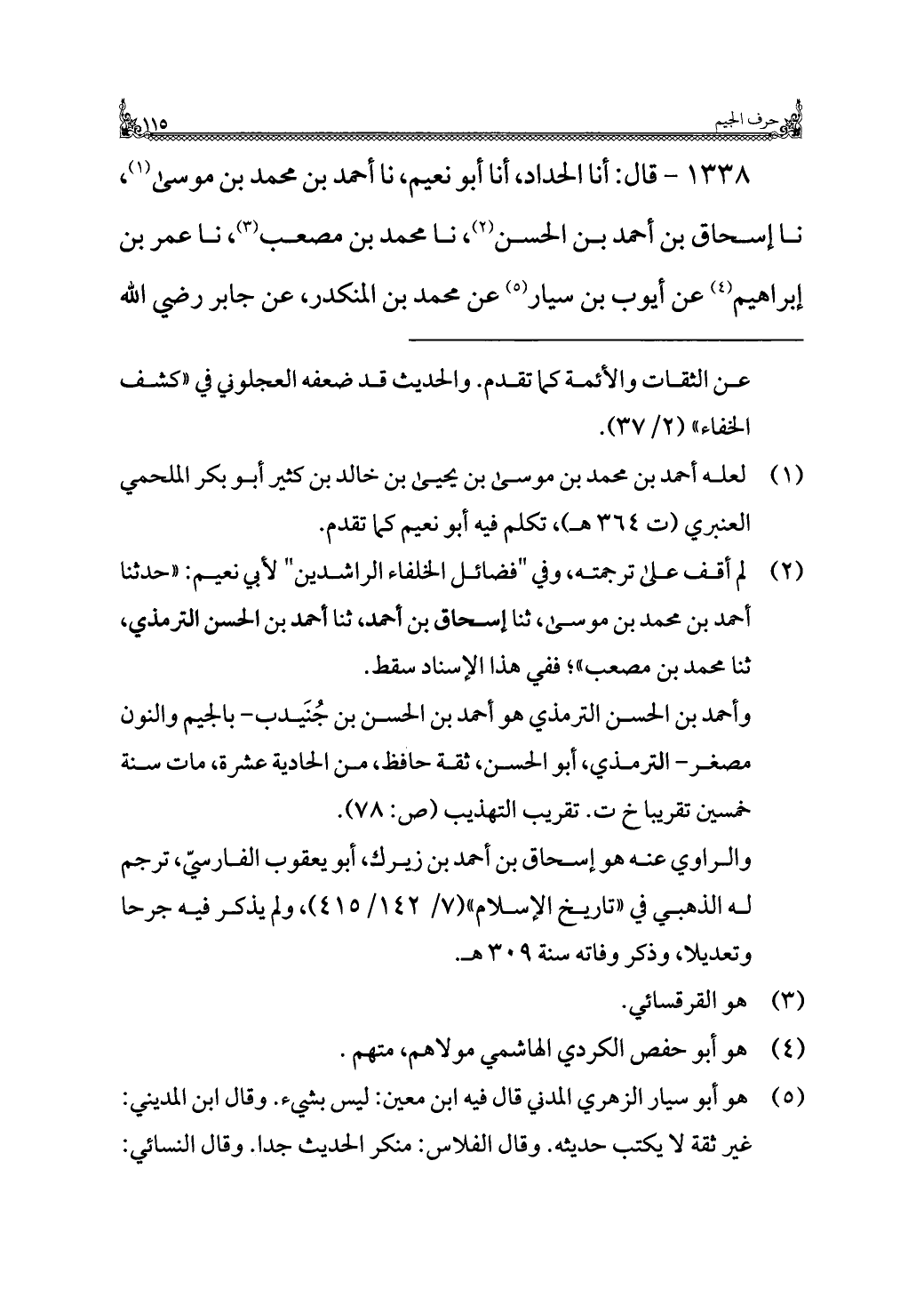 ١٣٣٨ - قال: أنا الحداد، أنا أبو نعيم، نا أحمد بن محمد بن موسى (¬١)، نا إسحاق بن أحمد بن الحسن (¬٢)، نا محمد بن مصعب (¬٣)، نا عمر بن إبراهيم (¬٤) عن أيوب بن سيار (¬٥) عن محمد بن المنكدر، عن جابر رضي الله