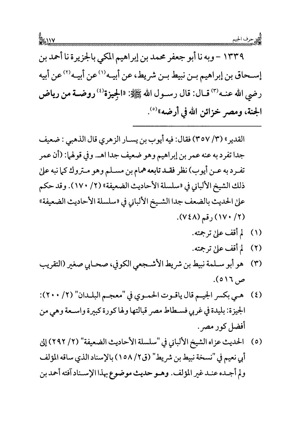 ١٣٣٩ - وبه نا أبو جعفر محمد بن إبراهيم المكي بالجزيرة نا أحمد بن إسحاق بن إبراهيم بن نبيط بن شريط، عن أبيه (¬١) عن أبيه (¬٢) عن أبيه رضي الله عنه (¬٣) قال: قال رسول الله - صلى الله عليه وسلم -: "الجِيزة (¬٤) روضة من رياض الجنة، ومصر خزائن الله في أرضه" (¬٥).