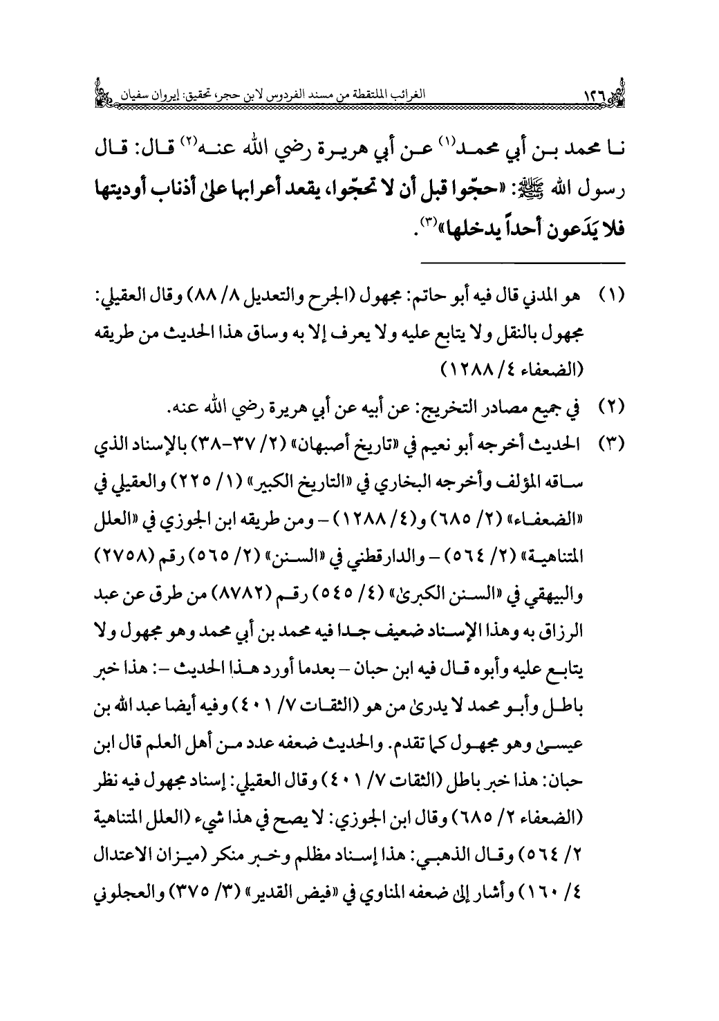 نا محمد بن أبي محمد (¬١) عن أبي هريرة رضي الله عنه (¬٢) قال: قال رسول الله - صلى الله عليه وسلم -: "حجّوا قبل أن لا تحجّوا، يقعد أعرابها على أذناب أوديتها فلا يَدَعون أحدًا يدخلها" (¬٣).