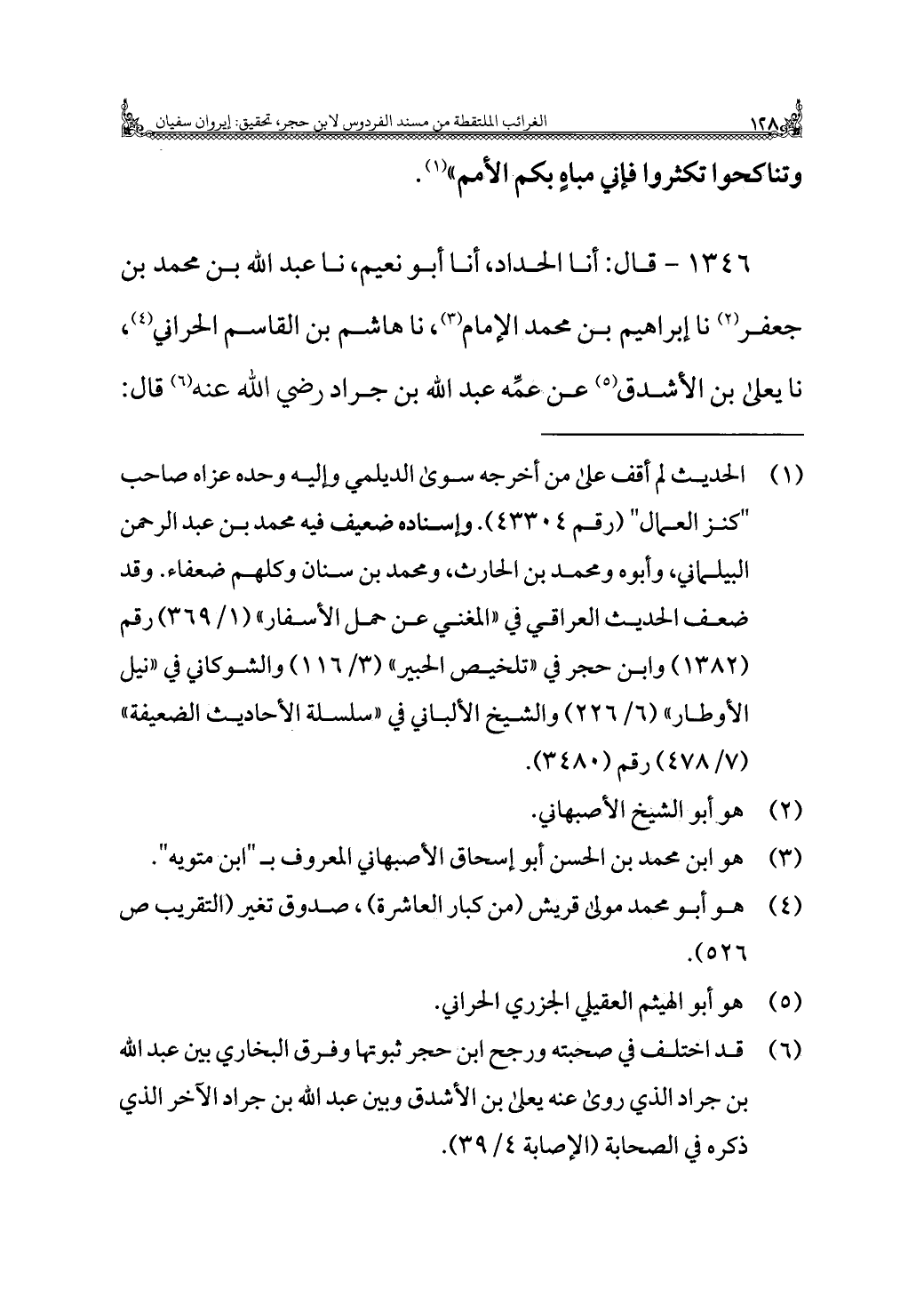 ١٣٤٦ - قال: أنا الحداد، أنا أبو نعيم، نا عبد الله بن محمد بن جعفر (¬٢) نا إبراهيم بن محمد الإمام (¬٣)، نا هاشم بن القاسم الحراني (¬٤)، نا يعلى بن الأشدق (¬٥) عن عمِّه عبد الله بن جراد رضي الله عنه (¬٦) قال: