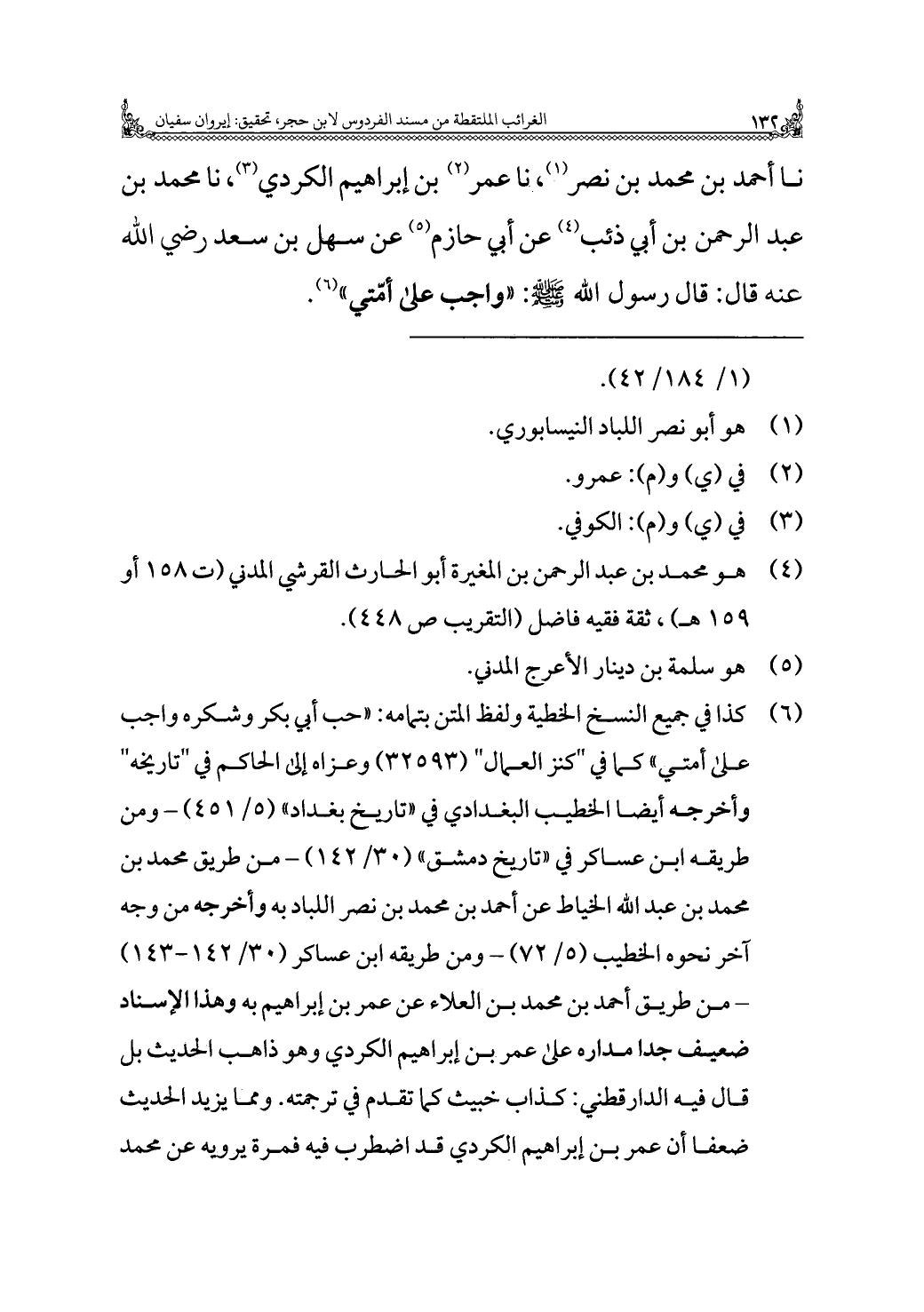 نا أحمد بن محمد بن نصر (¬١)، نا عمر (¬٢) بن إبراهيم الكردي (¬٣)، نا محمد بن عبد الرحمن بن أبي ذئب (¬٤) عن أبي حاتم (¬٥) عن سهل بن سعد رضي الله عنه قال: قال رسول الله - صلى الله عليه وسلم -: "واجب على أمّتي" (¬٦).