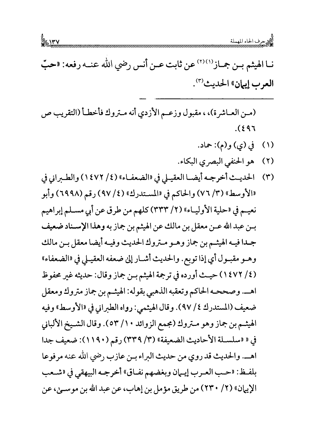 نا الهيثم بن جماز (¬١) (¬٢) عن ثابت عن أنس رضي الله عنه رفعه: "حبّ العرب إيمان" الحديث (¬٣).