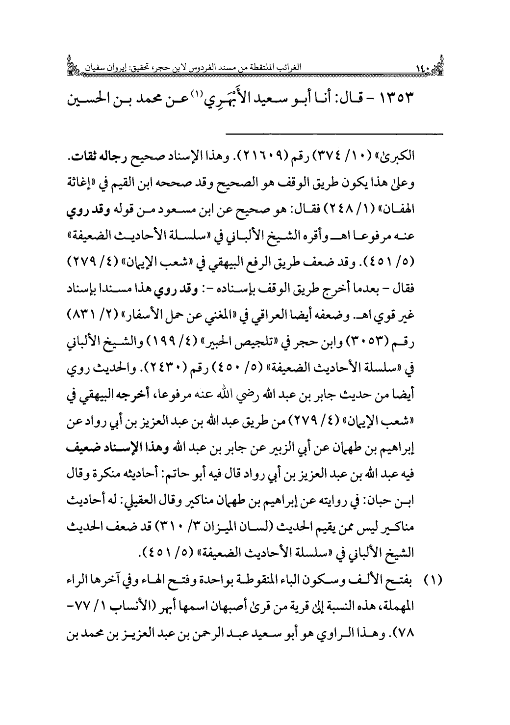 (¬١) بفتح الألف وسكون الباء المنقوطة بواحدة وفتح الهاء وفي آخرها الراء المهملة، هذه النسبة إلى قرية من قرى أصبهان اسمها أبهر (الأنساب ١/ ٧٧ - ٧٨). وهذا الراوي هو أبو سعيد عبد الرحمن بن عبد العزيز بن محمد بن =