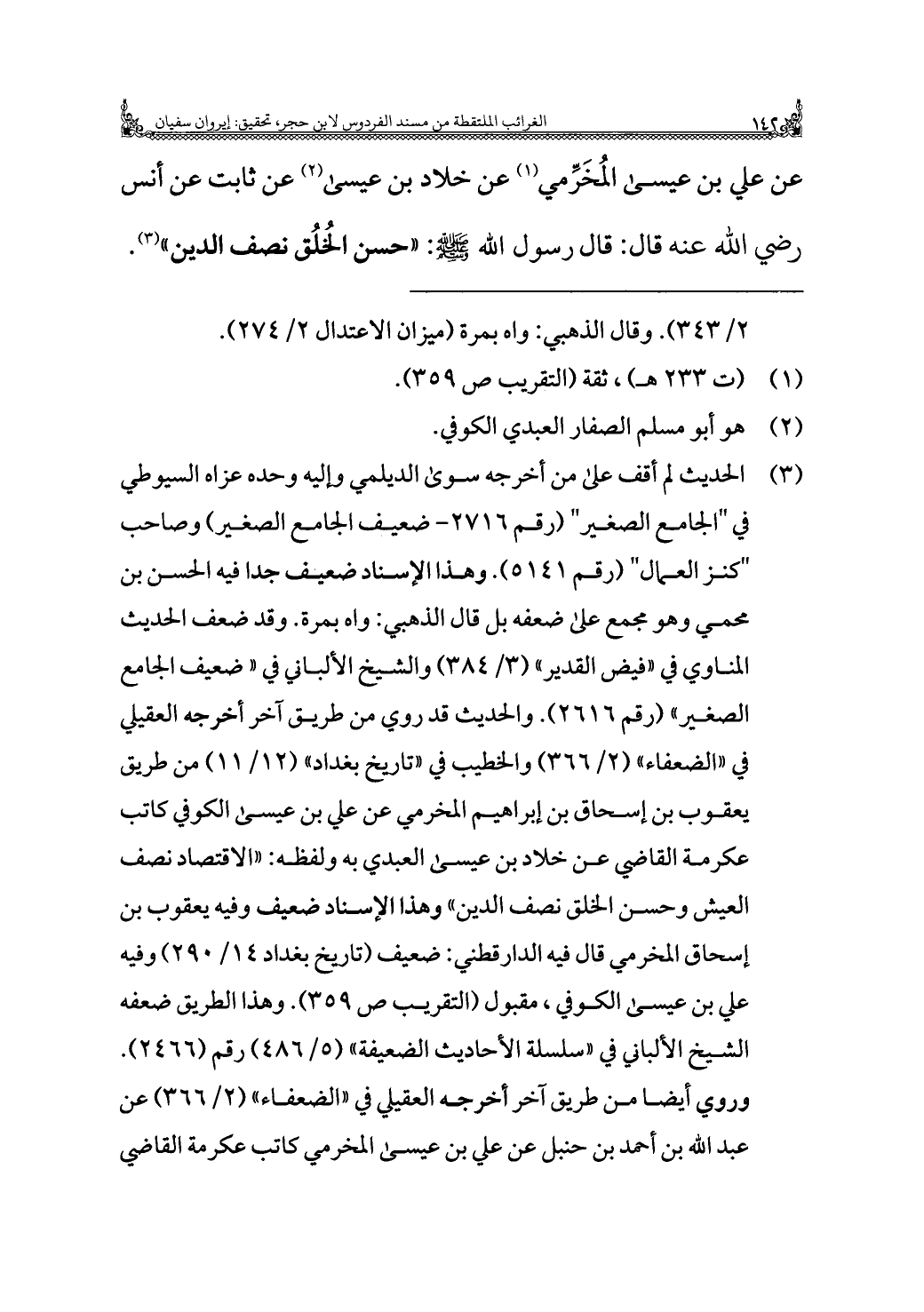 (¬٣) الحديث لم أقف على من أخرجه سوى الديلمي وإليه وحده عزاه السيوطي في "الجامع الصغير" (رقم ٢٧١٦ - ضعيف الجامع الصغير) وصاحب "كنز العمال" (رقم ٥١٤١). وهذا الإسناد ضعيف جدًا فيه الحسن بن محمي وهو مجمع على ضعفه بل قال الذهبي: واه بمرة. وقد ضعف الحديث المناوي في "فيض القدير" (٣/ ٣٨٤) والشيخ الألباني في "ضعيف الجامع الصغير" (رقم ٢٦١٦). والحديث قد روي من طريق آخر أخرجه العقيلي في "الضعفاء" (٢/ ٣٦٦) والخطيب في "تاريخ بغداد" (١٢/ ١١) من طريق يعقوب بن إسحاق بن إبراهيم المخرمي عن علي بن عيسى الكوفي كاتب عكرمة القاضي عن خلاد بن عيسى العبدي به ولفظه: "الاقتصاد نصف العيش وحسن الخلق نصف الدين" وهذا الإسناد ضعيف وفيه يعقوب بن إسحاق المخرمي قال فيه الدارقطني: ضعيف (تاريخ بغداد ١٤/ ٢٩٠) وفيه علي بن عيسى الكوفي، مقبول (التقريب ص ٣٥٩). وهذا الطريق ضعفه الشيخ الألباني في "سلسلة الأحاديث الضعيفة" (٥/ ٤٨٦) رقم (٢٤٦٦). وروي أيضًا من طريق آخر أخرجه العقيلي في "الضعفاء" (٢/ ٣٦٦) عن عبد الله بن أحمد بن حنبل عن علي بن عيسى المخرمي كاتب عكرمة القاضي =