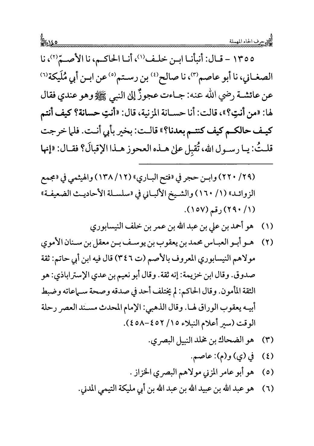 ١٣٥٥ - قال: أنبأنا ابن خلف (¬١)، أنا الحاكم، نا الأصمّ (¬٢)، نا الصغاني، نا أبو عاصم (¬٣)، نا صالح (¬٤) بن رستم (¬٥) عن ابن أبي مُلَيكة (¬٦) عن عائشة رضي الله عنها: جاءت عجوزٌ إلى النبي - صلى الله عليه وسلم - وهو عندي فقال لها: "من أنتِ؟ "، قالت: أنا حسانة المزنية، قال: "أنتِ حسانة؟ كيف أنتم كيف حالكم كيف كنتم بعدنا؟ " قالت: بخير بأبي أنت. فلما خرجت قلتُ: يا رسول الله، تُقبِل على هذه العجوز هذا الإقبالَ؟ فقال: "إنها