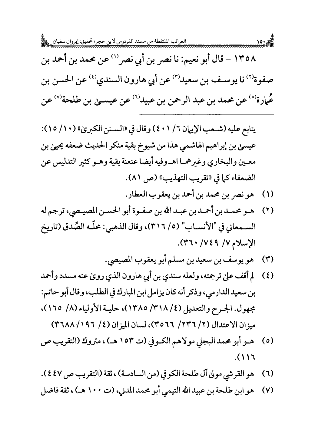 ١٣٥٨ - قال أبو نعيم: نا نصر بن أبي نصر (¬١) عن محمد بن أحمد بن صفوة (¬٢) نا يوسف بن سعيد (¬٣) عن أبي هارون السندي (¬٤) عن الحسن بن عُمارة (¬٥) عن محمد بن عبد الرحمن بن عبيد (¬٦) عن عيسى بن طلحة (¬٧) عن