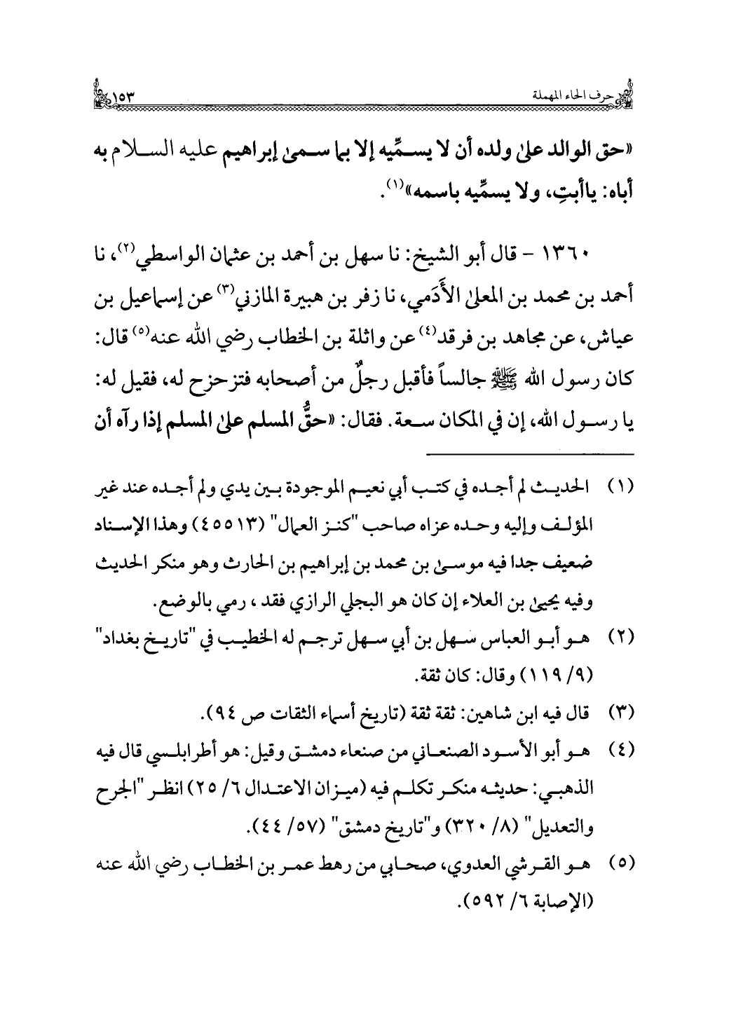 ١٣٦٠ - قال أبو الشيخ: نا سهل بن أحمد بن عثمان الواسطي (¬٢)، نا أحمد بن محمد بن المعلى الأَدَمي، نا زفر بن هبيرة المازني (¬٣) عن إسماعيل بن عياش، عن مجاهد بن فرقد (¬٤) عن واثلة بن الخطاب رضي الله عنه (¬٥) قال: كان رسول الله - صلى الله عليه وسلم - جالسًا فأقبل رجلٌ من أصحابه فتزحزح له، فقيل له: يا رسول الله، إن في المكان سعة. فقال: "حقُّ المسلم على المسلم إذا رآه أن