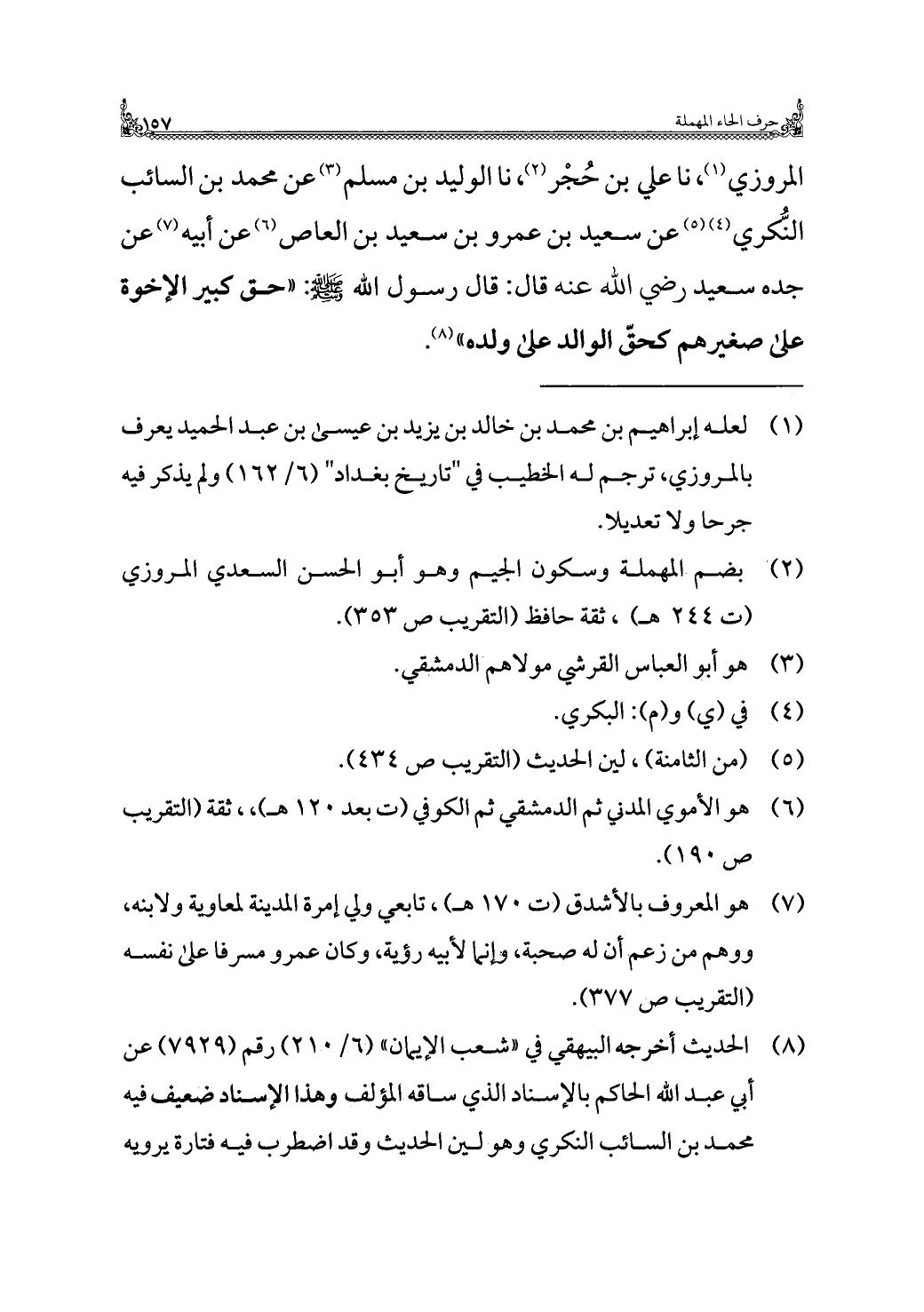 المروزي (¬١)، نا علي بن حُجْر (¬٢)، نا الوليد بن مسلم (¬٣) عن محمد بن السائب النُّكري (¬٤) (¬٥) عن سعيد بن عمرو بن سعيد بن العاص (¬٦) عن أبيه (¬٧) عن جده سعيد رضي الله عنه قال: قال رسول الله - صلى الله عليه وسلم -: "حق كبير الإخوة على صغيرهم كحقّ الوالد على ولده" (¬٨).