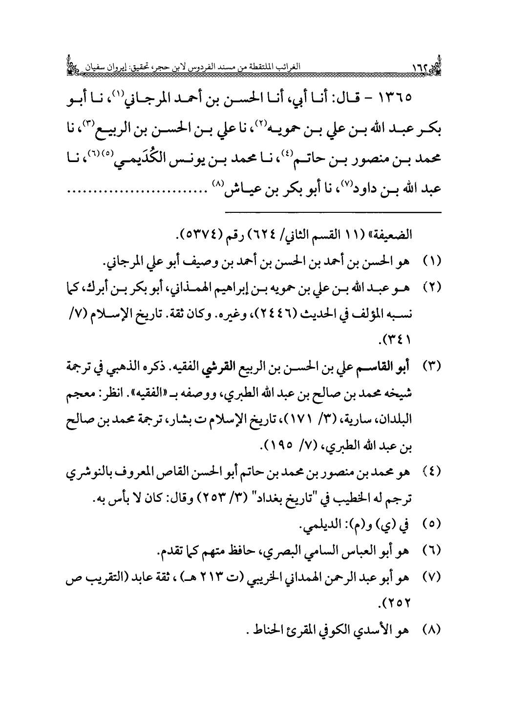 ١٣٦٥ - قال: أنا أبي، أنا الحسن بن أحمد المرجاني (¬١)، نا أبو بكر عبد الله بن علي بن حمويه (¬٢)، نا علي بن الحسن بن الربيع (¬٣)، نا محمد بن منصور بن حاتم (¬٤)، نا محمد بن يونس الكُدَيمي (¬٥) (¬٦)، نا عبد الله بن داود (¬٧)، نا أبو بكر بن عياش (¬٨). . . . . . . . . .