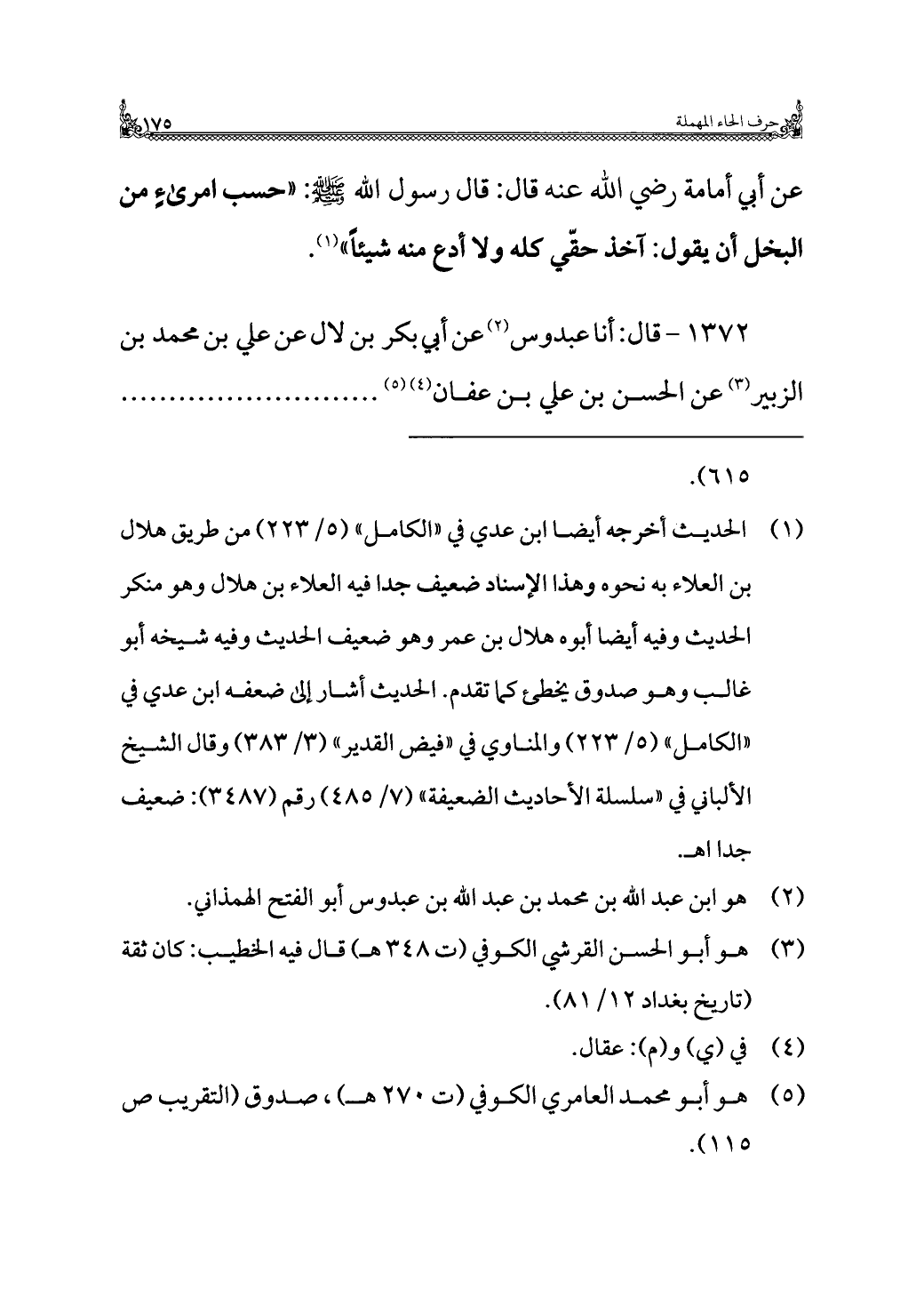 ١٣٧٢ - قال: أنا عبدوس (¬٢) عن أبي بكر بن لال عن علي بن محمد بن الزبير (¬٣) عن الحسن بن علي بن عفان (¬٤) (¬٥). . . . . . . . . . .