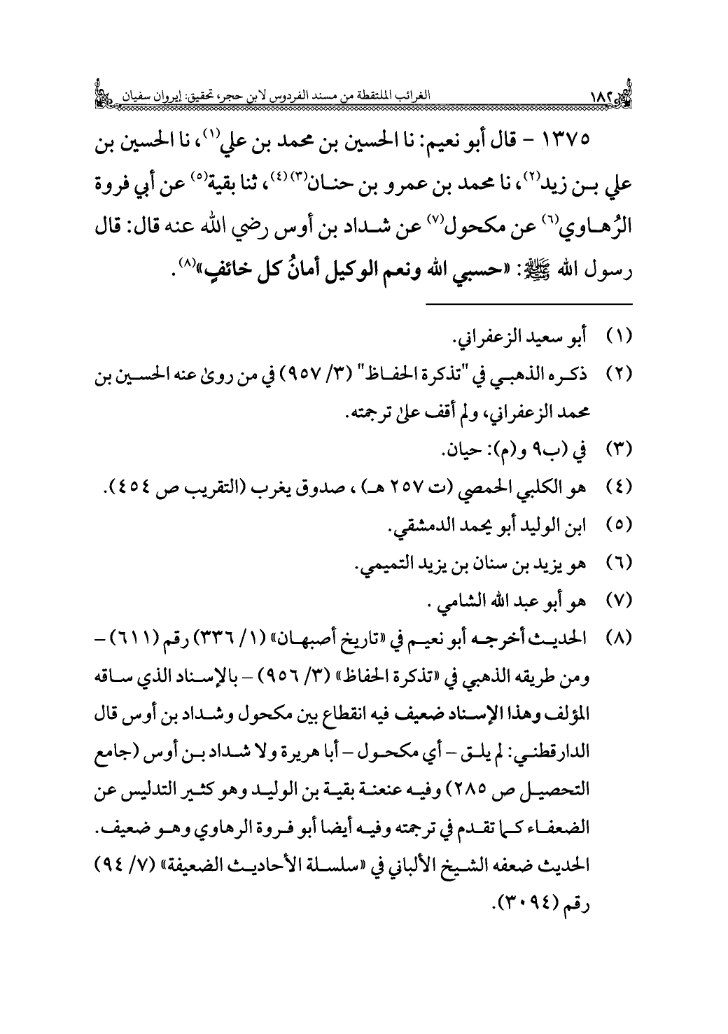 ١٣٧٥ - قال أبو نعيم: نا الحسين بن محمد بن علي (¬١)، نا الحسين بن علي بن زيد (¬٢)، نا محمد بن عمرو بن حنان (¬٣) (¬٤)، ثنا بقية (¬٥) عن أبي فروة الرُهاوي (¬٦) عن مكحول (¬٧) عن شداد بن أوس رضي الله عنه قال: قال رسول الله - صلى الله عليه وسلم -: "حسبي الله ونعم الوكيل أمانُ كل خائفٍ" (¬٨).