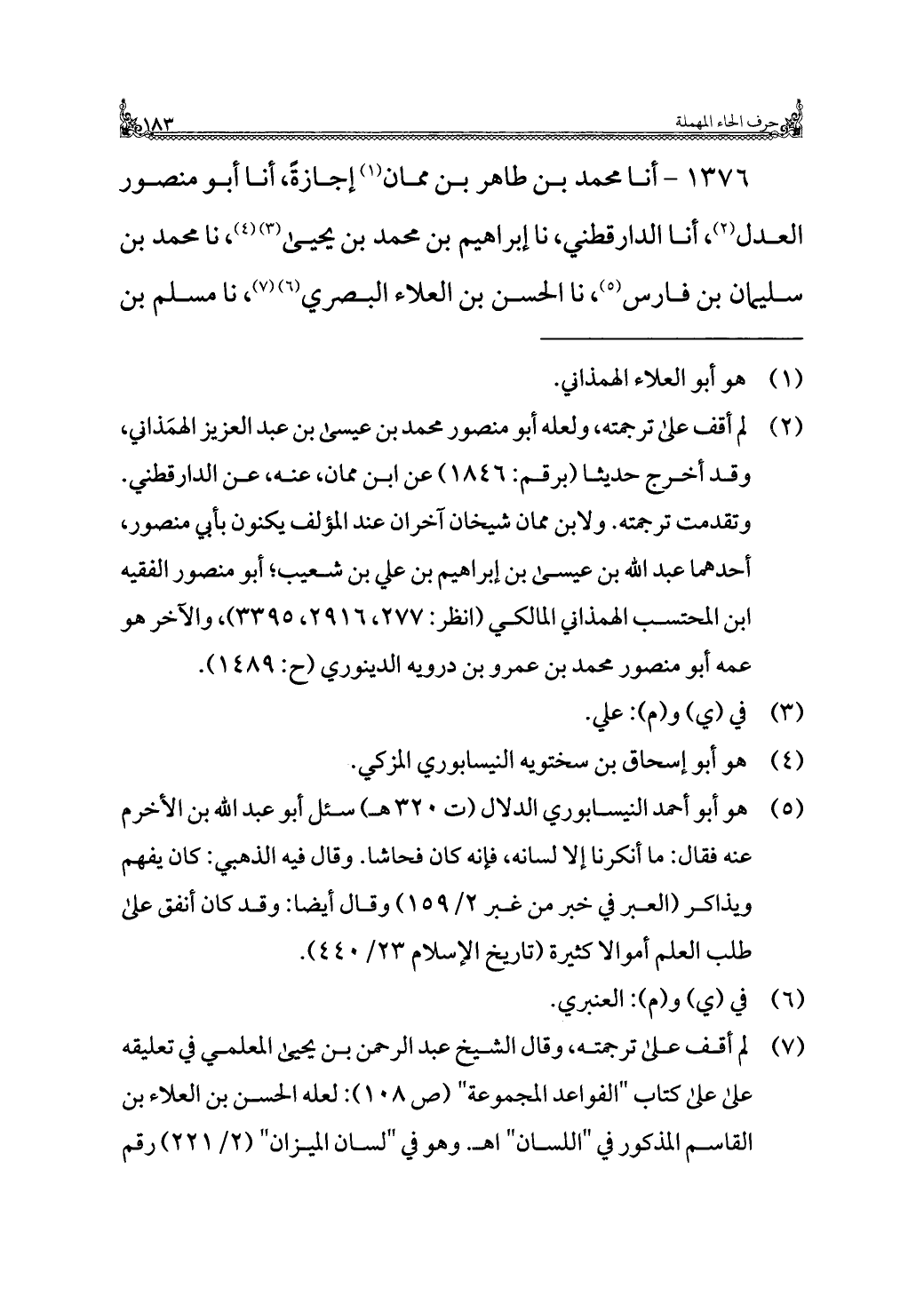 ١٣٧٦ - أنا محمد بن طاهر بن ممان (¬١) إجازةً، أنا أبو منصور العدل (¬٢)، أنا الدارقطني، نا إبراهيم بن محمد بن يحيى (¬٣) (¬٤)، نا محمد بن سليمان بن فارس (¬٥)، نا الحسن بن العلاء البصري (¬٦) (¬٧)، نا مسلم بن