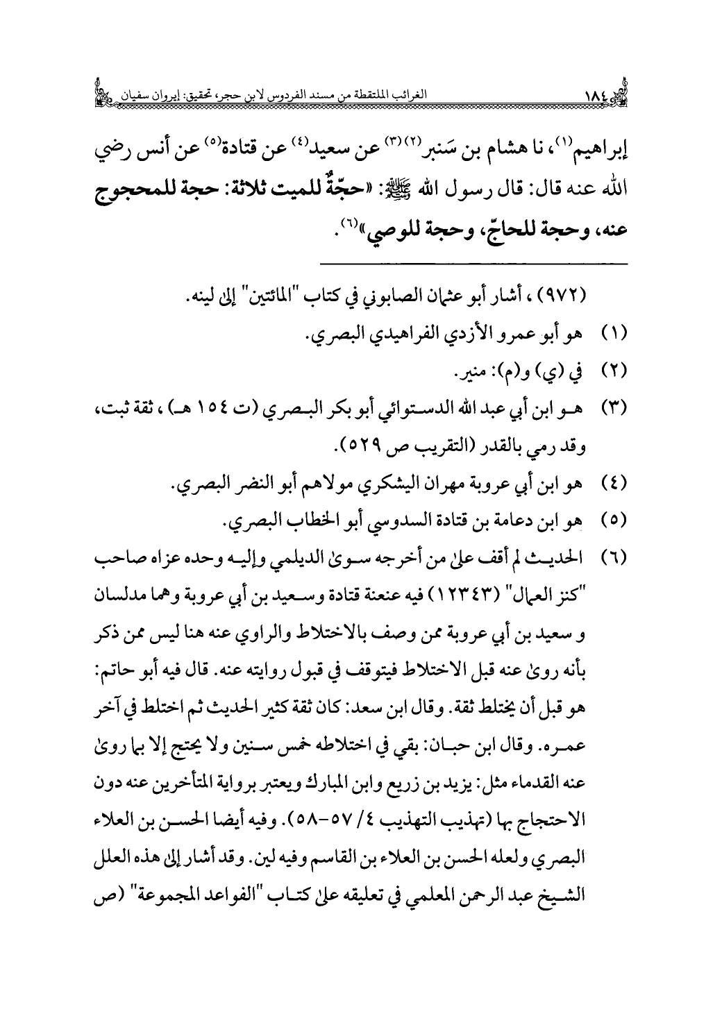 إبراهيم (¬١)، نا هشام بن سَنبر (¬٢) (¬٣) عن سعيد (¬٤) عن قتادة (¬٥) عن أنس رضي الله عنه قال: قال رسول الله - صلى الله عليه وسلم -: "حجّةٌ للميت ثلاثة: حجة للمحجوج عنه، وحجة للحاجّ، وحجة للوصي" (¬٦).