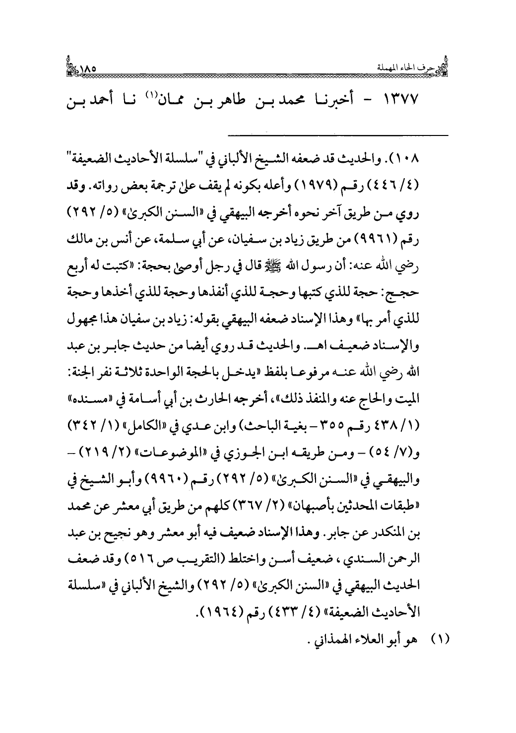 = ١٠٨). والحديث قد ضعفه الشيخ الألباني في "سلسلة الأحاديث الضعيفة" (٤/ ٤٤٦) رقم (١٩٧٩) وأعله بكونه لم يقف على ترجمة بعض رواته. وقد روي من طريق آخر نحوه أخرجه البيهقي في "السنن الكبرى" (٥/ ٢٩٢) رقم (٩٩٦١) من طريق زياد بن سفيان، عن أبي سلمة، عن أنس بن مالك رضي الله عنه: أن رسول الله - صلى الله عليه وسلم - قال في رجل أوصى بحجة: "كتبت له أربع حجج: حجة للذي كتبها وحجة للذي أنفذها وحجة للذي أخذها وحجة للذي أمر بها" وهذا الإسناد ضعفه البيهقي بقوله: زياد بن سفيان هذا مجهول والإسناد ضعيف اهـ. والحديث قد روي أيضًا من حديث جابر بن عبد الله رضي الله عنه مرفوعًا بلفظ "يدخل بالحجة الواحدة ثلاثة نفر الجنة: الميت والحاج عنه والمنفذ ذلك"، أخرجه الحارث بن أبي أسامة في "مسنده" (١/ ٤٣٨ رقم ٣٥٥ - بغية الباحث) وابن عدي في "الكامل" (١/ ٣٤٢) و (٧/ ٥٤) - ومن طريقه ابن الجوزي في "الموضوعات" (٢/ ٢١٩) - والبيهقي في "السنن الكبرى" (٥/ ٢٩٢) رقم (٩٩٦٠) وأبو الشيخ في "طبقات المحدثين بأصبهان" (٢/ ٣٦٧) كلهم من طريق أبي معشر عن محمد بن المنكدر عن جابر. وهذا الإسناد ضعيف فيه أبو معشر وهو نجيح بن عبد الرحمن السندي، ضعيف أسن واختلط (التقريب ص ٥١٦) وقد ضعف الحديث البيهقي في "السنن الكبرى" (٥/ ٢٩٢) والشيخ الألباني في "سلسلة الأحاديث الضعيفة" (٤/ ٤٣٣) رقم (١٩٦٤).