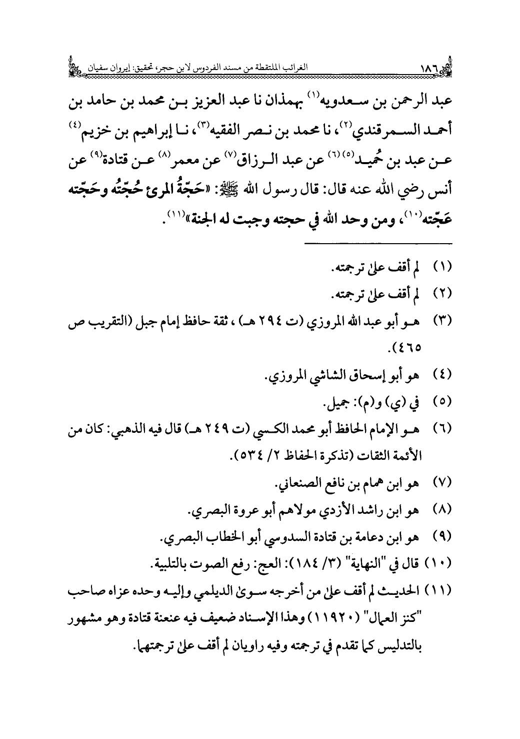 عبد الرحمن بن سعدويه (¬١) بهمذان نا عبد العزيز بن محمد بن حامد بن أحمد السمرقندي (¬٢)، نا محمد بن نصر الفقيه (¬٣)، نا إبراهيم بن خزيم (¬٤) عن عبد بن حُميد (¬٥) (¬٦) عن عبد الرزاق (¬٧) عن معمر (¬٨) عن قتادة (¬٩) عن أنس رضي الله عنه قال: قال رسول الله - صلى الله عليه وسلم -: "حَجّةُ المرئ حُجّتُه وحَجّته عَجّته (¬١٠)، ومن وحد الله في حجته وجبت له الجنة" (¬١١).