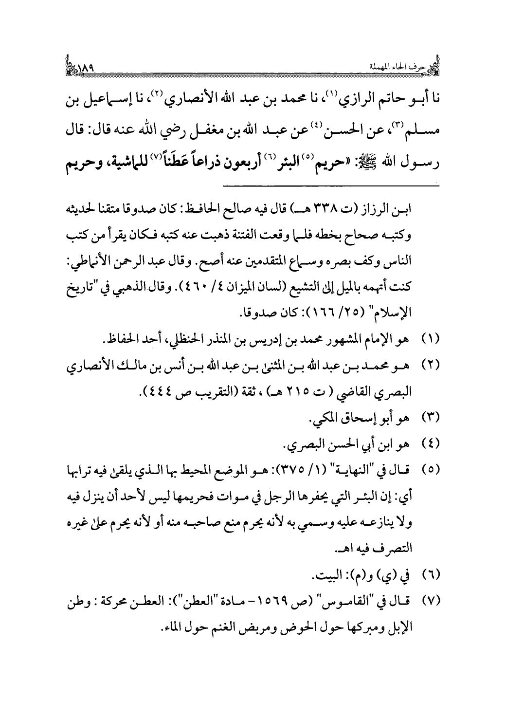 نا أبو حاتم الرازي (¬١)، نا محمد بن عبد الله الأنصاري (¬٢)، نا إسماعيل بن مسلم (¬٣)، عن الحسن (¬٤) عن عبد الله بن مغفل رضي الله عنه قال: قال رسول الله - صلى الله عليه وسلم -: "حريم (¬٥) البئر (¬٦) أربعون ذراعًا عَطَنًا (¬٧) للماشية، وحريم