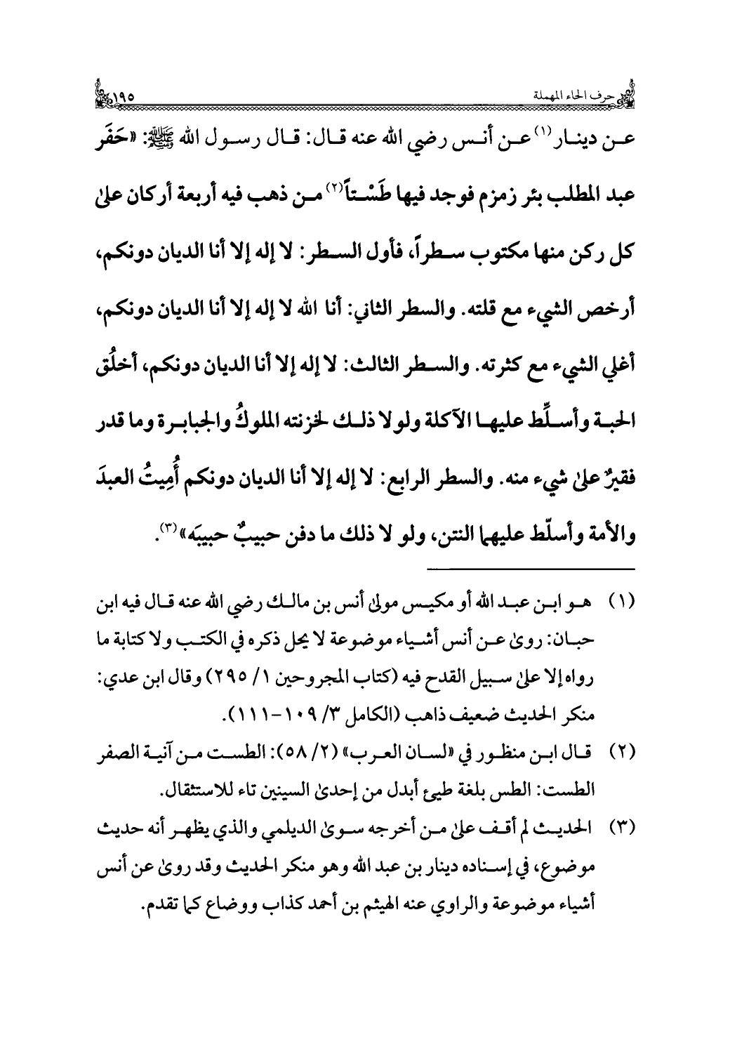 عن دينار (¬١) عن أنس رضي الله عنه قال: قال رسول الله - صلى الله عليه وسلم -: "حَفَر عبد المطلب بئر زمزم فوجد فيها طَسْتًا (¬٢) من ذهب فيه أربعة أركان على كل ركن منها مكتوب سطرًا، فأول السطر: لا إله إلا أنا الديان دونكم، أرخص الشيء مع قلته. والسطر الثاني: أنا الله لا إله إلا أنا الديان دونكم، أغلي الشيء مع كثرته. والسطر الثالث: لا إله إلا أنا الديان دونكم، أخلُق الحبة وأسلِّط عليها الآكلة ولولا ذلك لخزنته الملوكُ والجبابرة وما قدر فقيرٌ على شيء منه. والسطر الرابع: لا إله إلا أنا الديان دونكم أُمِيتُ العبدَ والأمة وأسلّط عليهما النتن، ولولا ذلك ما دفن حبيبٌ حبيبَه" (¬٣).