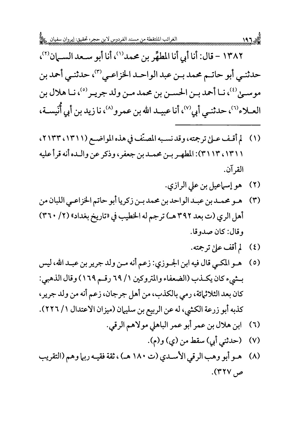 ١٣٨٢ - قال: أنا أبي أنا المطهِّر بن محمد (¬١)، أنا أبو سعد السمان (¬٢)، حدثني أبو حاتم محمد بن عبد الواحد الخزاعي (¬٣)، حدثني أحمد بن موسى (¬٤)، نا أحمد بن الحسن بن محمد من ولد جرير (¬٥)، نا هلال بن العلاء (¬٦)، حدثني أبي (¬٧)، أنا عبيد الله بن عمرو (¬٨)، نا زيد بن أبي أُنَيسة،