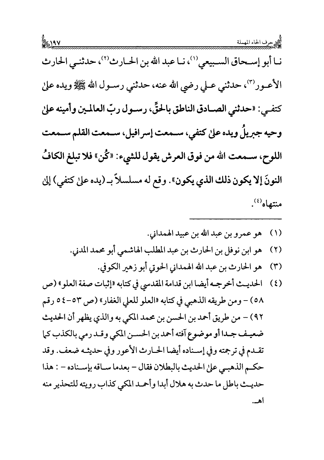 (¬٤) الحديث أخرجه أيضًا ابن قدامة المقدسي في كتابه "إثبات صفة العلو" (ص ٥٨) - ومن طريقه الذهبي في كتابه "العلو للعلي الغفار" (ص ٥٣ - ٥٤ رقم ٩٢) - من طريق أحمد بن الحسن بن محمد المكي به والذي يظهر أن الحديث ضعيف جدًا أو موضوع آفته أحمد بن الحسن المكي وقد رمي بالكذب كما تقدم في ترجمته وفي إسناده أيضًا الحارث الأعور وفي حديثه ضعف. وقد حكم الذهبي على الحديث بالبطلان فقال - بعدما ساقه بإسناده -: هذا حديث باطل ما حدث به هلال أبدًا وأحمد المكي كذاب رويته للتحذير منه اهـ.