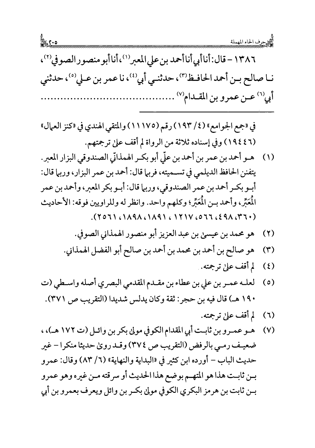 ١٣٨٦ - قال: أنا أبي أنا أحمد بن علي المعبر (¬١)، أنا أبو منصور الصوفي (¬٢)، نا صالح بن أحمد الحافظ (¬٣)، حدثني أبي (¬٤)، نا عمر بن علي (¬٥)، حدثني أبي (¬٦) عن عمرو بن المقدام (¬٧). . . . . . . . . . . . . . . . .