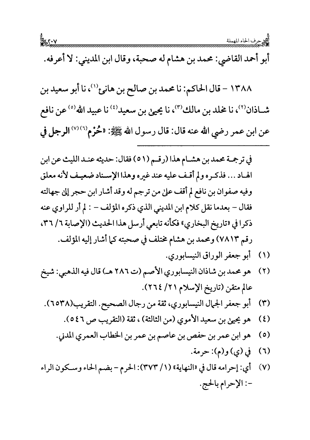 ١٣٨٨ - قال الحاكم: نا محمد بن صالح بن هانئ (¬١)، نا أبو سعيد بن شاذان (¬٢)، نا مخلد بن مالك (¬٣)، نا يحيى بن سعيد (¬٤) نا عبيد الله (¬٥) عن نافع عن ابن عمر رضي الله عنه قال: قال رسول الله - صلى الله عليه وسلم -: "حُرْم (¬٦) (¬٧) الرجل في